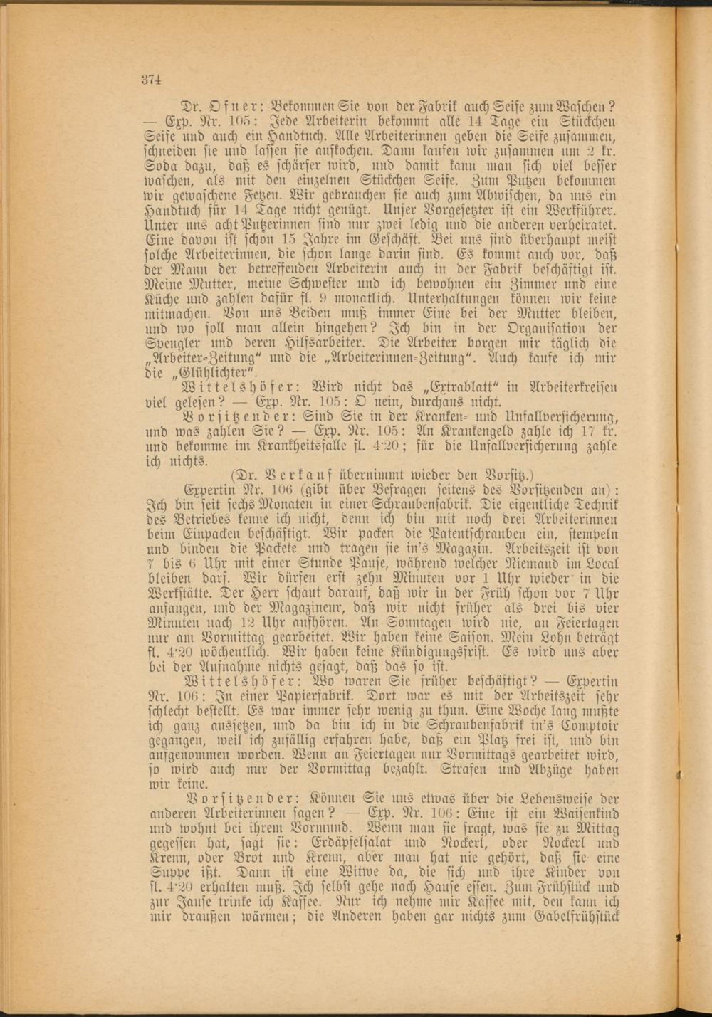 Vorsitzender: Sind Sie in der Kranken- und Unfallversicherung, und was zahlen Sie? — Exp. Nr. 105: An Krankengeld zahle ich 17 kr. und bekomme im Krankheitsfälle fl. 4'20; für die Unfallversicherung zahle ich nichts.