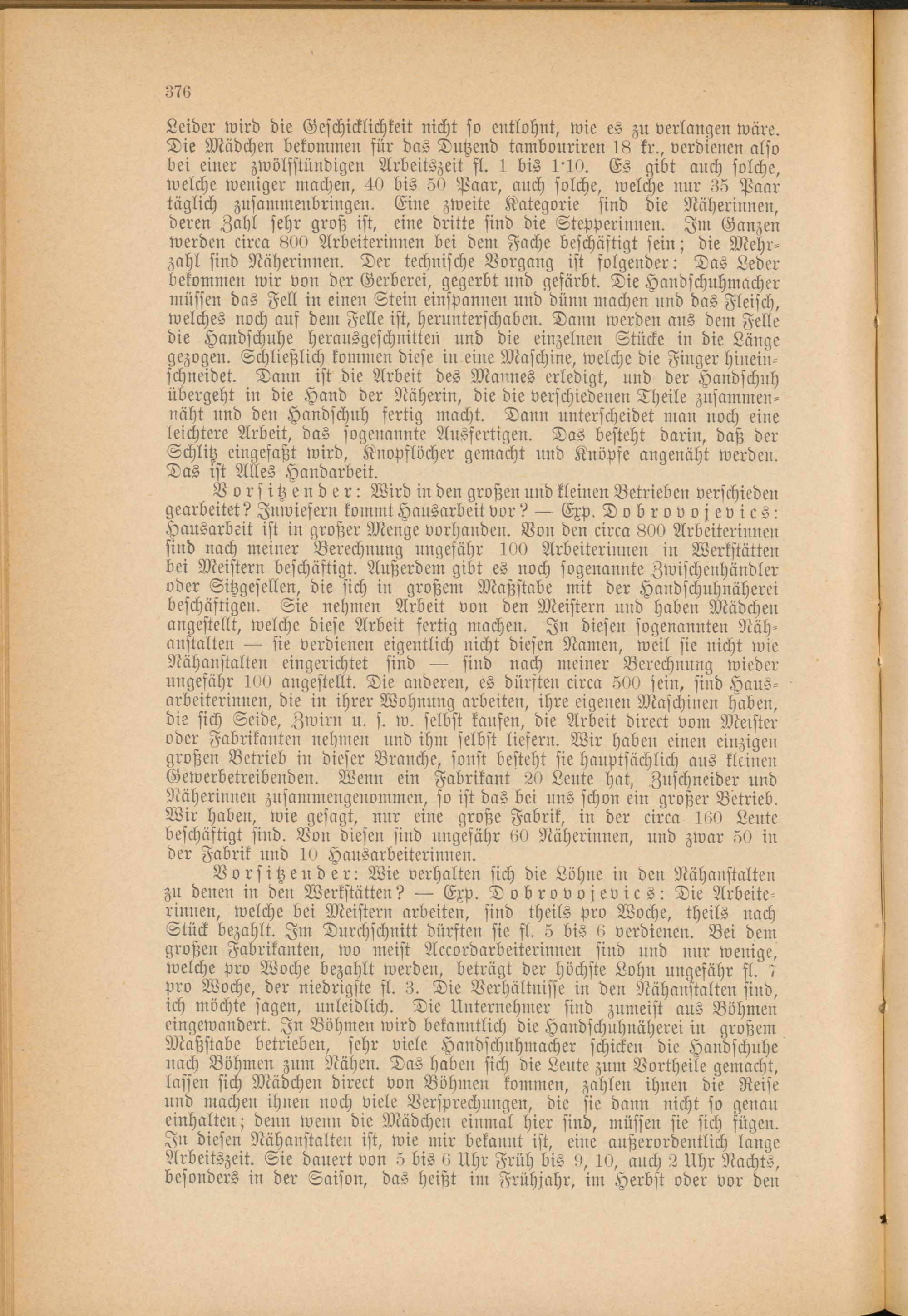 Vorsitzender: Wie verhalten sich die Löhne in den Nähanstalten zu denen in den Werkstätten? — Exp. Dobrovojevics: Die Arbeiterinnen, welche bei Meistern arbeiten, sind theils pro Woche, theils nach Stück bezahlt. Im Durchschnitt dürften sie fl. 5 bis 6 verdienen. Bei dem großen Fabrikanten, wo meist Accordarbeiterinnen sind und nur wenige, welche pro Woche bezahlt werden, beträgt der höchste Lohn ungefähr fl. 7 Pro Woche, der niedrigste fl. 8. Die Verhältnisse in den Nähanstalten sind, ich möchte sagen, unleidlich. Die Unternehmer sind zumeist aus Böhmen eingewandert. In Böhmen wird bekanntlich die Handschuhnäherei in großem Maßstabe betrieben, sehr viele Handschuhmacher schicken die Handschuhe nach Böhmen zum Nähen. Das haben sich die Leute zum Vortheile gemacht, lassen sich Mädchen direct von Böhmen kommen, zahlen ihnen die Reise und machen ihnen noch viele Versprechungen, die sie dann nicht so genau einhalten; denn wenn die Mädchen einmal hier sind, müssen sie sich fügen. In diesen Nähanstalten ist, wie mir bekannt ist, eine außerordentlich lange Arbeitszeit. Sie dauert von 5 bis 6 Uhr Früh bis 9, 10, auch 2 Uhr Nachts, besonders in der Saison, das heißt im Frühjahr, im Herbst oder vor den
