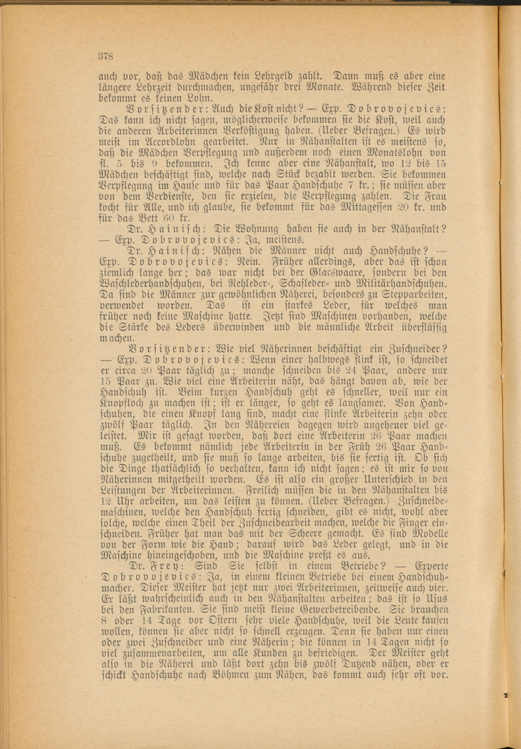 Dr. Hainisch: Nähen die Männer nicht auch Handschuhe? — Exp. Dobrovojevics: Nein. Früher allerdings, aber das ist schon ziemlich lange her; das war nicht bei der Glacöwaare, sondern bei den Waschlederhandschuhen, bei Rehleder-, Schafleder- und Militärhandschnhen. Da sind die Männer zur gewöhnlichen Näherei, besonders zu Stepparbeiten, verwendet worden. Das ist ein starkes Leder, für welches man früher noch keine Maschine hatte. Jetzt sind Maschinen vorhanden, welche die Stärke des Leders überwinden und die männliche Arbeit überflüssig machen.
