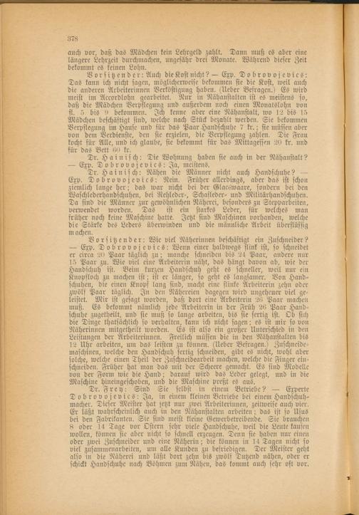 Dr. Frey: Sind Sie selbst in einem Betriebe? — Experte Dobrovojevics: Ja, in einem kleinen Betriebe bei einem Handschuhmacher. Dieser Meister hat jetzt nur zwei Arbeiterinnen, zeitweise auch vier. Er läßt wahrscheinlich auch in den Nähanstalten arbeiten; das ist so Usus bei den Fabrikanten. Sie sind meist kleine Gewerbetreibende. Sie brauchen 8 oder 14 Tage vor Ostern sehr viele Handschuhe, weil die Leute kaufen wollen, können sie aber nicht so schnell erzeugen. Denn sie haben nur einen oder zwei Zuschneider und eine Näherin; die können in 14 Tagen nicht so viel zusammenarbeiten, um alle Kunden zu befriedigen. Der Meister geht also in die Näherei und läßt dort zehn bis zwölf Dutzend nähen, oder er schickt Handschuhe nach Böhmen zum Nähen, das kommt auch sehr oft vor.