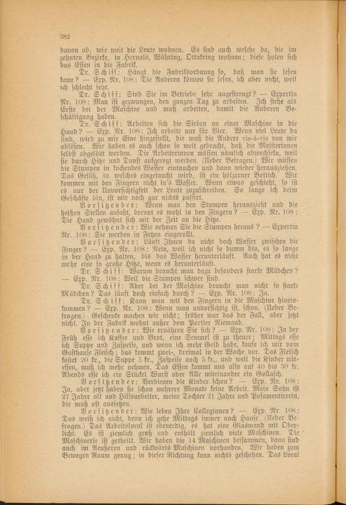 Dr. Schiff: Sind Sie im Betriebe sehr angestrengt? — Expertin Nr. 108: Man ist gezwungen, den ganzen Tag zu arbeiten. Ich stehe als Erste bei der Maschine und muß arbeiten, damit die Anderen Beschäftigung haben.