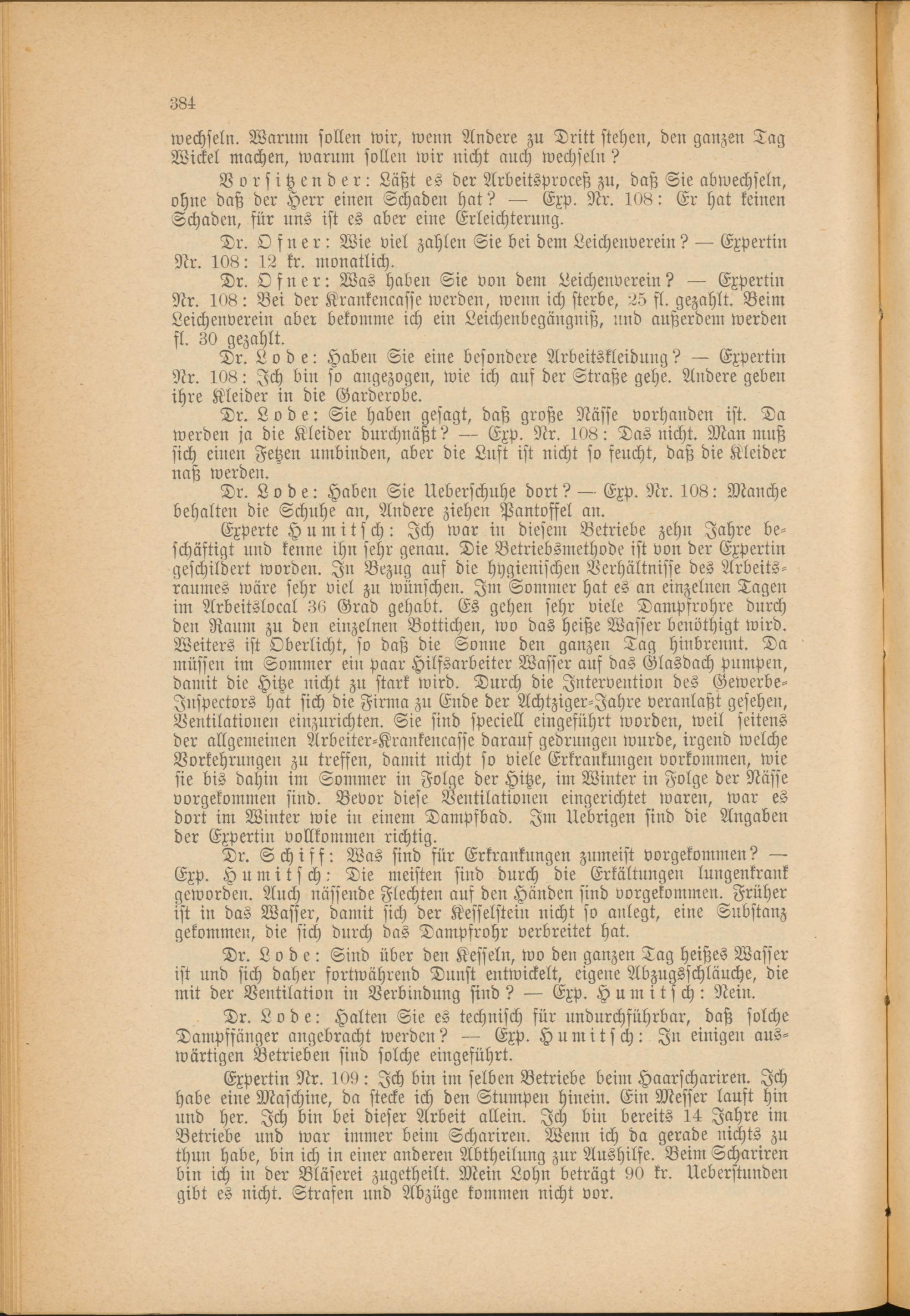 Experte Humitsch: Ich war in diesem Betriebe zehn Jahre beschäftigt und kenne ihn sehr genau. Die Betriebsmethode ist von der Expertin geschildert worden. In Bezug auf die hygienischen Verhältnisse des Arbeitsraumes wäre sehr viel zu wünschen. Im Sommer hat es an einzelnen Tagen im Arbeitslocal 36 Grad gehabt. Es gehen sehr viele Dampfrohre durch den Raum zu den einzelnen Bottichen, wo das heiße Wasser benöthigt wird. Weiters ist Oberlicht, so daß die Sonne den ganzen Tag hinbrennt. Da müssen im Sommer ein paar Hilfsarbeiter Wasser auf das Glasdach pumpen, damit die Hitze nicht zu stark wird. Durch die Intervention des Gewerbe- Jnspectors hat sich die Firma zu Ende der Achtziger-Jahre veranlaßt gesehen, Ventilationen einzurichten. Sie sind speciell eingeführt worden, weil seitens der allgemeinen Arbeiter-Krankencaffe darauf gedrungen wurde, irgend welche Vorkehrungen zu treffen, damit nicht so viele Erkrankungen vorkommen, wie sie bis dahin im Sommer in Folge der Hitze, im Winter in Folge der Nässe vorgekommen sind. Bevor diese Ventilationen eingerichtet waren, war es dort im Winter wie in einem Dampfbad. Im Uebrigen sind die Angaben der Expertin vollkommen richtig.