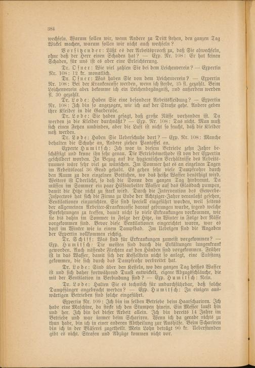 Expertin Nr. 109: Ich bin im selben Betriebe beim Haarschariren. Ich habe eine Maschine, da stecke ich den Stumpen hinein. Ein Messer lauft hin und her. Ich bin bei dieser Arbeit allein. Ich bin bereits 14 Jahre im Betriebe und war immer beim Schariren. Wenn ich da gerade nichts zu thun habe, bin ich in einer anderen Abtheilung zur Aushilfe. Beim Schariren bin ich in der Bläserei zugetheilt. Mein Lohn beträgt 90 kr. Ueberstunden gibt es nicht. Strafen und Abzüge kommen nicht vor.