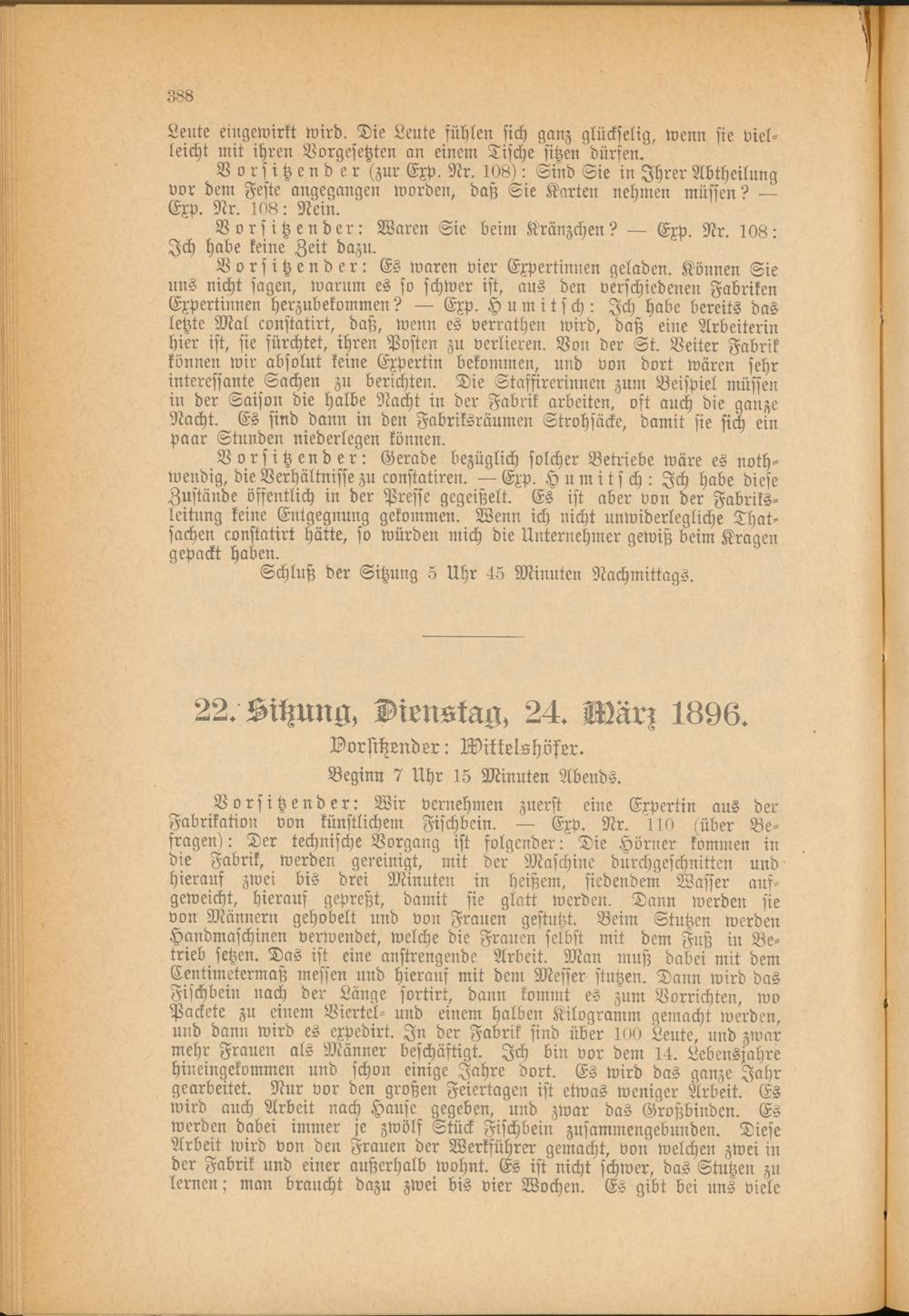 Vorsitzender: Wir vernehmen zuerst eine Expertin aus der Fabrikation von künstlichem Fischbein. — Exp. Nr. 110 (über Befragen): Der technische Vorgang ist folgender: Die Hörner kommen in die Fabrik, werden gereinigt, mit der Maschine durchgeschnitten und hierauf zwei bis drei Minuten in heißem, siedendem Wasser ausgeweicht, hierauf gepreßt, damit sie glatt werden. Dann werden sie von Männern gehobelt und von Frauen gestutzt. Beim Stutzen werden Handmaschinen verwendet, welche die Frauen selbst mit dem Fuß in Betrieb setzen. Das ist eine anstrengende Arbeit. Man muß dabei mit dem Centimetermaß messen und hierauf mit den: Messer stutzen. Dann wird das Fischbein nach der Länge sortirt, dann kommt es zum Vorrichten, wo Packete zu einem Viertel- und einem halben Kilogramm gemacht werden, und dann wird es expedirt. In der Fabrik sind über 100 Leute, und zwar mehr Frauen als Männer beschäftigt. Ich bin vor dem 14. Lebensjahre hineingekommen und schon einige Jahre dort. Es wird das ganze Jahr gearbeitet. Nur vor den großen Feiertagen ist etwas weniger Arbeit. Es wird auch Arbeit nach Hause gegeben, und zwar das Großbinden. Es werden dabei immer je zwölf Stück Fischbein zusammengebunden. Diese Arbeit wird von den Frauen der Werkführer gemacht, von welchen zwei in der Fabrik und einer außerhalb wohnt. Es ist nicht schwer, das Stutzen zu lernen; man braucht dazu zwei bis vier Wochen. Es gibt bei uns viele