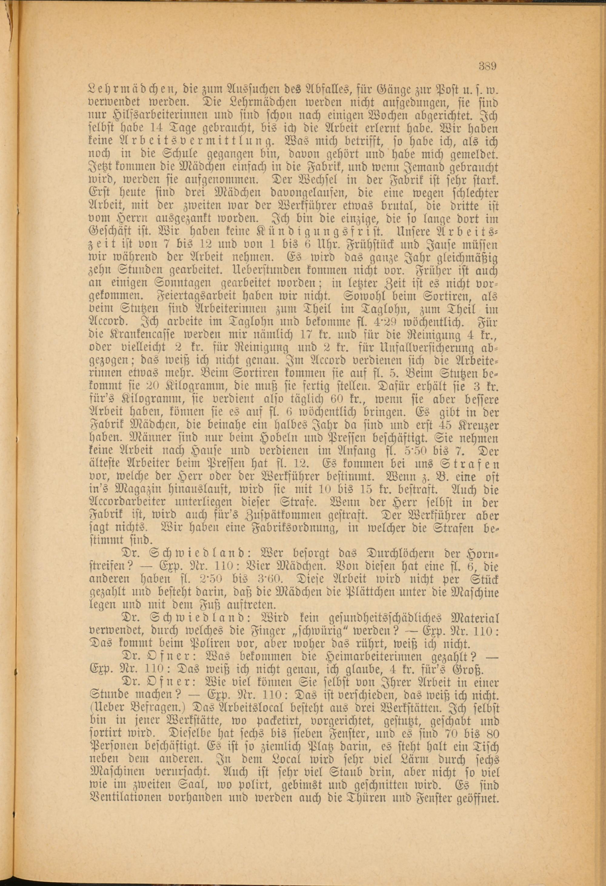 Dr. Schwiedland: Wer besorgt das Durchlöchern der Hornstreifen? — Exp. Nr. 110: Vier Mädchen. Von diesen hat eine fl. 6, die anderen haben fl. 2'50 bis 3'60. Diese Arbeit wird nicht per Stück gezahlt und besteht darin, daß die Mädchen die Plättchen unter die Maschine legen und mit dem Fuß auftreten.