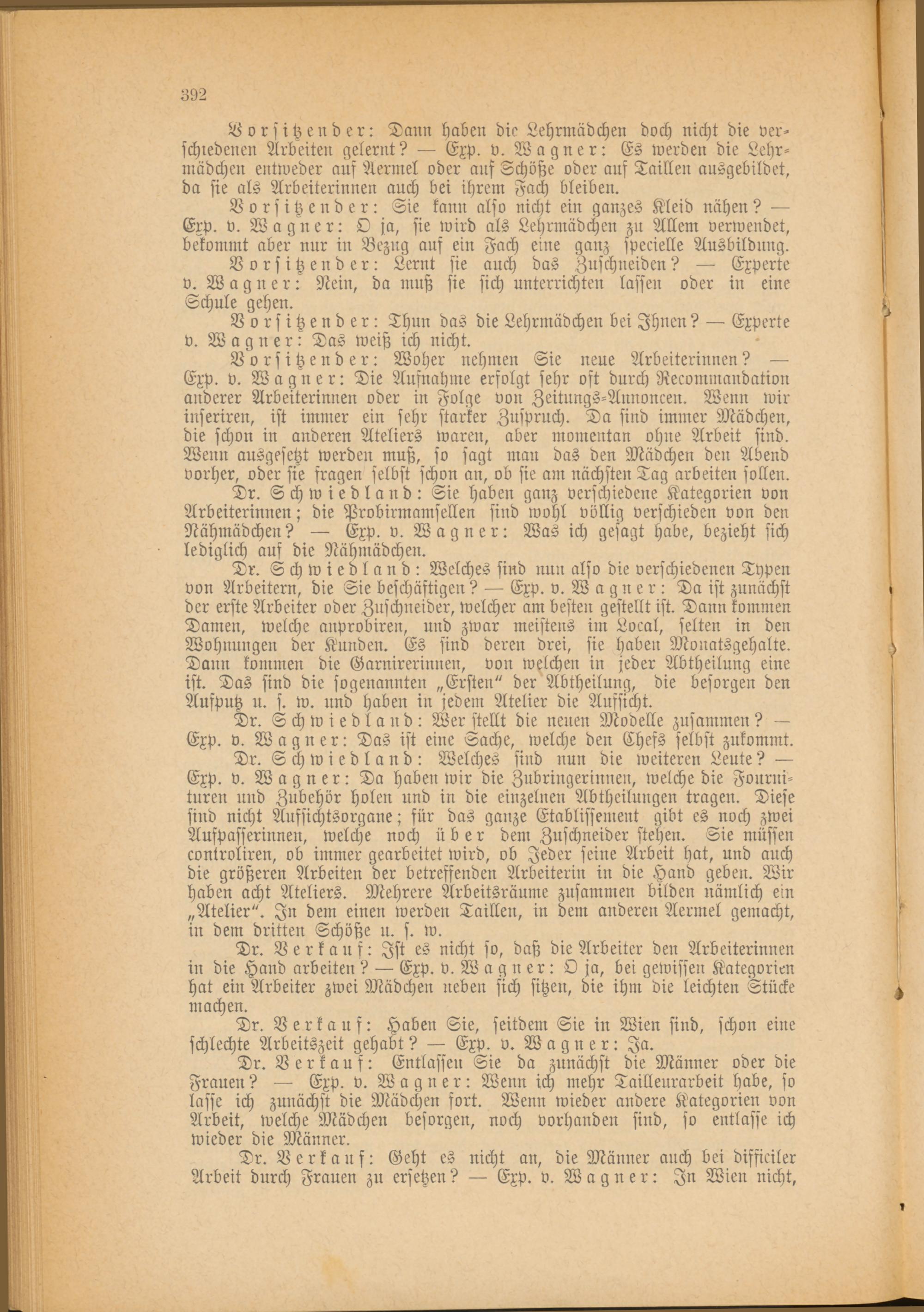 Dr. Schwiedland: Sie haben ganz verschiedene Kategorien von Arbeiterinnen; die Probirmamsellen sind wohl völlig verschieden von den Nähmädchen? — Exp. v. Wagner: Was ich gesagt habe, bezieht sich lediglich aus die Nähmädchen.