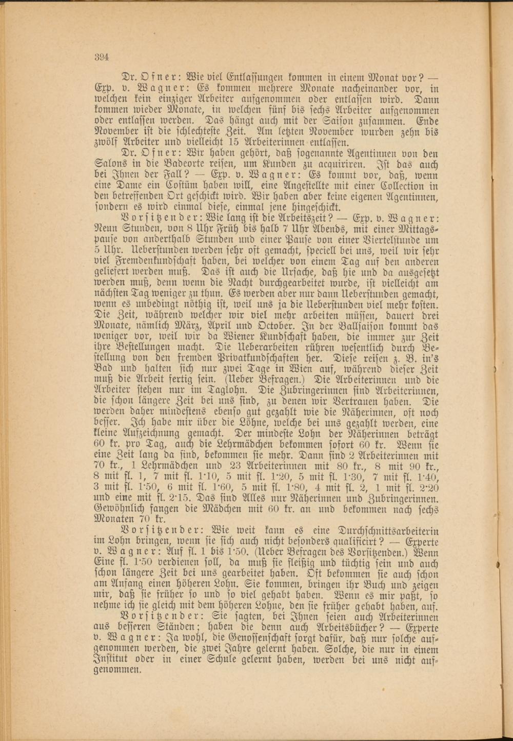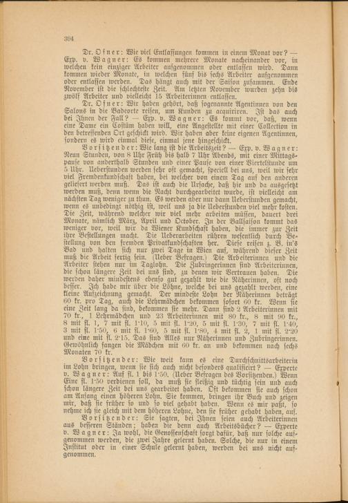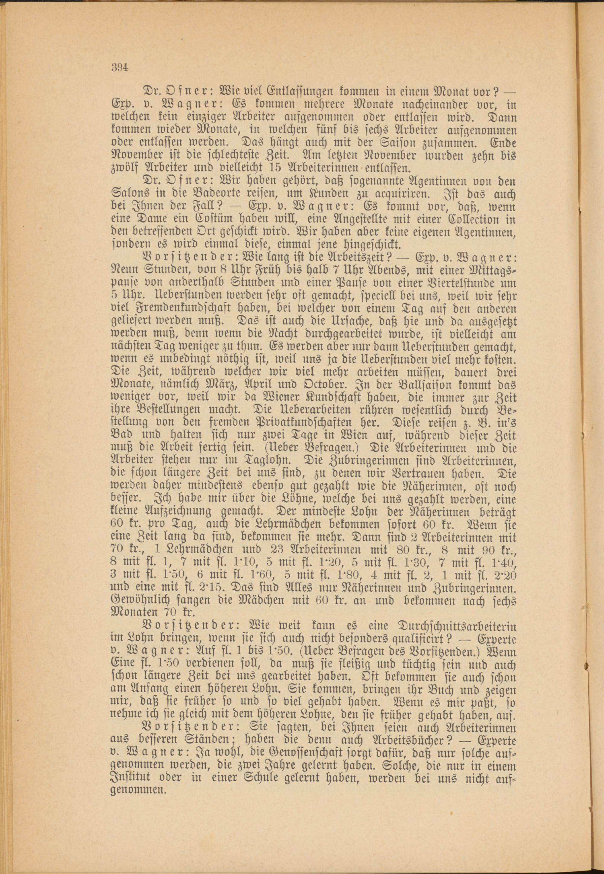 Vorsitzender: Wie lang ist die Arbeitszeit? — Exp. v. Wagner: Nenn Stunden, von 8 Uhr Früh bis halb 7 Uhr Abends, mit einer Mittagspause von anderthalb Stunden und einer Pause von einer Viertelstunde um 5 Uhr. Ueberstunden werden sehr oft gemacht, speciell bei uns, weil wir sehr viel Fremdenkundschäst haben, bei welcher von einem Tag auf den anderen geliefert werden muß. Das ist auch die Ursache, daß hie und da ausgesetzt werden muß, denn wenn die Nacht durchgearbeitet wurde, ist vielleicht am nächsten Tag weniger zu thun. Es werden aber nur dann Ueberstunden gemacht, wenn es unbedingt nöthig ist, weil uns ja die Ueberstunden viel mehr kosten. Die Zeit, während welcher wir viel mehr arbeiten müssen, dauert drei Monate, nämlich März, April und October. In der Ballsaison kommt das weniger vor, weil wir da Wiener Kundschaft haben, die immer zur Zeit ihre Bestellungen macht. Die Ueberarbeiten rühren wesentlich durch Bestellung von den fremden Privatkundschaften her. Diese reisen z. B. in's Bad und halten sich nur zwei Tage in Wien auf, während dieser Zeit muß die Arbeit fertig sein. (Ueber Befragen.) Die Arbeiterinnen und die Arbeiter stehen nur im Taglohn. Die Zubringerinnen sind Arbeiterinnen, die schon längere Zeit bei uns sind, zu denen wir Vertrauen haben. Die werden daher mindestens ebenso gut gezahlt wie die Näherinnen, oft noch besser. Ich habe mir über die Löhne, welche bei uns gezahlt werden, eine kleine Aufzeichnung gemacht. Der mindeste Lohn der Näherinnen beträgt 60 kr. pro Tag, auch die Lehrmädchen bekommen sofort 60 kr. Wenn sie eine Zeit lang da sind, bekommen sie mehr. Dann sind 2 Arbeiterinnen mit 70 kr., 1 Lehrmädchen und 23 Arbeiterinnen mit 80 kr., 8 mit 90 kr., 8 mit fl. 1, 7 mit fl. 1-10, 5 mit fl. 1'20, 5 mit st. 1'30, 7 mit fl. 1'40, 3 mit fl. 1'50, 6 mit fl. 1'60, 5 mit fl. 1'80, 4 mit fl. 2, 1 mit fl. 2'20 und eine mit fl. 2-15. Das sind Alles nur Näherinnen und Zubringerinnen. Gewöhnlich fangen die Mädchen mit 60 kr. an und bekommen nach sechs Monaten 70 kr.