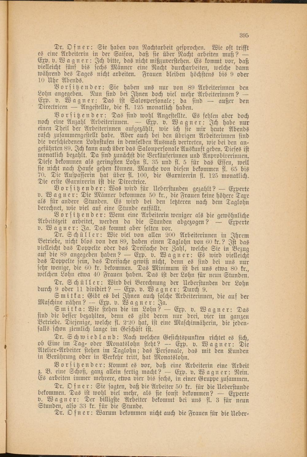 Dr. Ofner: Sie haben von Nachtarbeit gesprochen. Wie oft trifft es eine Arbeiterin in der Saison, daß sie über Nacht arbeiten muß? — Exv. v. Wagner: Ich bitte, das nicht mißzuverstehen. Es kommt vor, daß vielleicht fünf bis sechs Männer eine Nacht durcharbeiten, welche dann während des Tages nicht arbeiten. Frauen bleiben höchstens bis 9 oder 10 Uhr Abends.