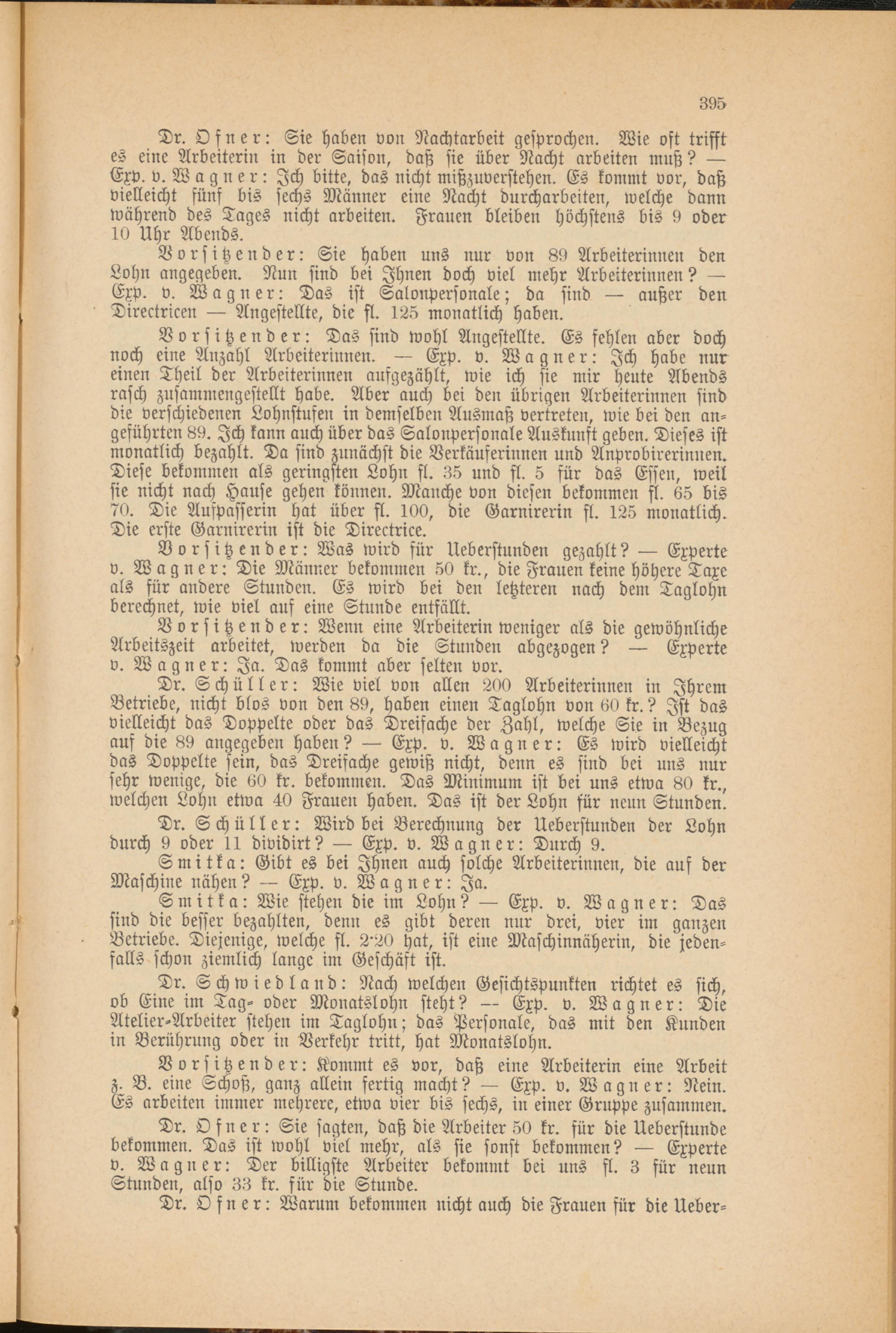 Smitka: Wie stehen die im Lohn? — Exp. v. Wagner: Das sind die besser bezahlten, denn es gibt deren nur drei, vier im ganzen Betriebe. Diejenige, welche fl. 2'20 hat, ist eine Maschinnäherin, die jedenfalls schon ziemlich lange im Geschäft ist.