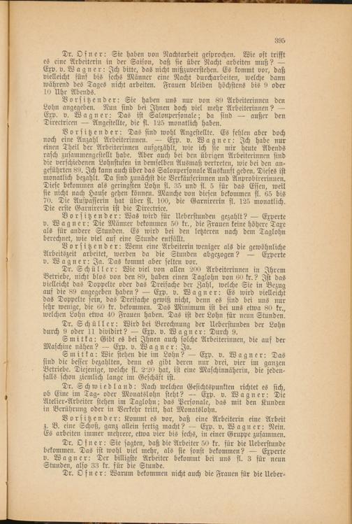 Vorsitzender: Was wird für Ueberstunden gezahlt? — Experte v. Wagner: Die Männer bekommen 50 kr., die Frauen keine höhere Taxe als für andere Stunden. Es wird bei den letzteren nach dem Taglohn berechnet, wie viel auf eine Stunde entfällt.