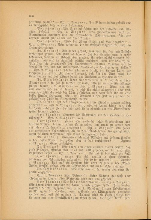 Dr. Schwiedland: Wenn eine Arbeiterin 80 kr. täglich, also pro Stunde circa 8 kr. hat, so werden ihr wohl, falls sie nur eine Viertelstunde zu spät kommt, 2 kr. abgezogen? — Exp. v. Wagner: Wenn eine um eine Viertelstunde zu spät kommt, so wird ihr nichts abgezogen; aber nach einer Viertelstunde wird die Thür geschlossen, und dann wird ihr die erste halbe Stunde abgezogen, also 4 kr. Während dieser Zeit muß sie vor der geschlossenen Thür im Stiegenhause warten.