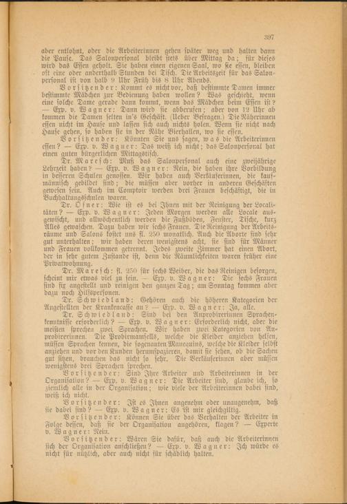 Vorsitzender: Könnten Sie uns sagen, was die Arbeiterinnen essen? — Exp. v. Wagner: Das weiß ich nicht; das Salonpersonal hat einen guten bürgerlichen Mittagstisch.