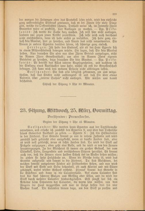 Vorsitzender: Wir werden heute Experten aus der Textilbranche vernehmen, und ersuche ich zunächst den Experten X, uns über das Technische seines Gewerbes Auskunft zu geben. — Experte : Ich bin Hilfsarbeiter in der Färberei. Das Gewebe kommt zu uns in rohem Zustande und wird zunächst halb gebleicht oder ausgekocht, wenn es dunkle Farben sind, oder es wird voll gebleicht, wenn es lichte Farben sind. Da wird der Stoff auf Prügeln ausgezogen; oben geht eine Rolle, und da wird er von den Frauen heruntergezogen. In der Bleicherei ist immer ein großer Gestank, der vom Chlorkalk, Soda, Laugenstein und verschiedenen Säuren herrührt. Es kommt auch vor, daß die Frauen einen halben Schuh tief im Wasser stehen müssen; da ziehen sie hohe Holzschuhe an. Wenn die Bleiche fertig ist, wird das Gewebe aufgerollt und kommt in die Färberei. Da sind Maschinen, bei welchen sowohl ausgelernte Färber als Hilfsarbeiter stehen, und nun wird der Stoff mit Seife und Soda behandelt, oft auch chlorirt und mit Säure gedämpft, wobei wieder Gestank entsteht. Hierauf kommt das Gewebe in die Stärkerei und dann in die Calanderhalle. Auf einem Calander sind drei bis fünf schwere Walzen aus Messing oder Eisen, und da wird der Stoff durch mehrere Calander hindurchgelassen. Erst jüngst hat sich ein Arbeiter beim Schmieren der Calander, die warm sein müssen, von drei Fingern die Haut weggerissen und war in Folge dessen drei bis vier Wochen krank. Die Calander dienen dazu, um den Stoff zu pressen und