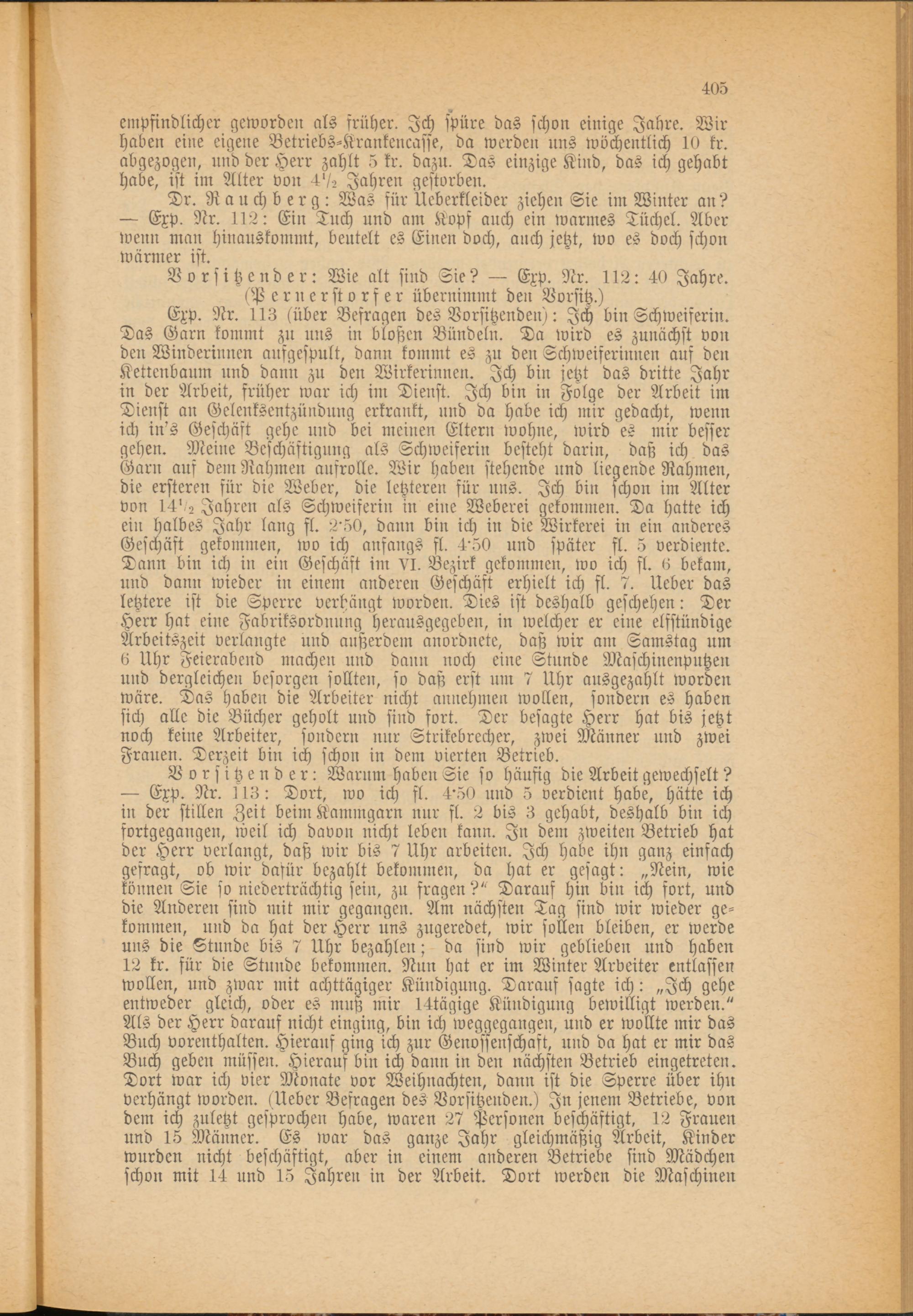 Exp. Nr. l13: Dort, wo ich fl. 4'50 und 5 verdient habe, hätte ich ir: der stillen Zeit beirr: Kammgarn nur fl. 2 bis 3 gehabt, deshalb bin ich fortgegangen, weil ich davon nicht leben kann. In den: zweiten Betrieb hat der Herr verlangt, daß wir bis 7 Uhr arbeiten. Ich habe ihn ganz einfach gefragt, ob wir dafür bezahlt bekommen, da hat er gesagt:Nein, wie können Sie so niederträchtig sein, zu fragen?" Darauf hin bin ich fort, und die Anderen sind mit mir gegangen. Am nächsten Tag sind wir wieder ge­kommen, und da hat der Herr uns zugeredet, wir sollen bleiben, er werde uns die Stunde bis 7 Uhr bezahlen; da sind wir geblieben und haben 12 kr. für die Stunde bekommen. Nun hat er im Winter Arbeiter entlassen wollen, und zwar mit achttägiger Kündigung. Darauf sagte ich:Ich gehe entweder gleich, oder es muß mir 14tägige Kündigung bewilligt werden." Als der Herr darauf nicht einging, bin ich weggegangen, und er wollte mir das Buch vorenthalten. Hierauf ging ich zur Genossenschaft, und da hat er mir das Buch geben müssen. Hierauf bin ich dann in den nächsten Betrieb eingetreten. Tort war ich vier Monate vor Weihnachten, dann ist die Sperre über ihn verhängt worden. (Ueber Befragen des Vorsitzenden.) In jenem Betriebe, von dem ich zuletzt gesprochen habe, waren 27 Personen beschäftigt, 12 Frauen und 15 Männer. Es war das ganze Jahr gleichmäßig Arbeit, Kinder wurden nicht beschäftigt, aber in einem anderen Betriebe sind Mädchen schon mit 14 und 15 Jahren in der Arbeit. Dort werden die Maschinen