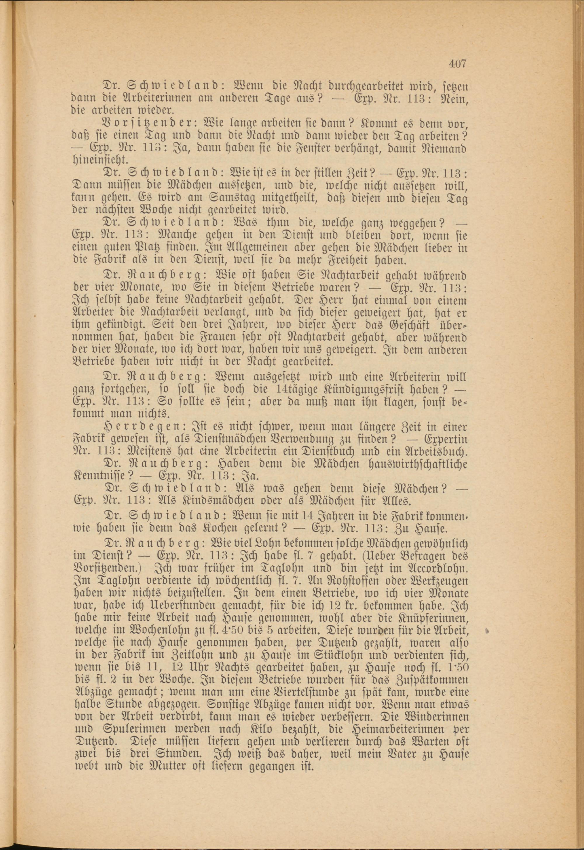Tr. Schwiedland: Wenn die Nacht durchgearbeitet wird, setzen dann die Arbeiterinnen am anderen Tage aus? — Exp. Nr. 113: Nein, die arbeiten wieder.