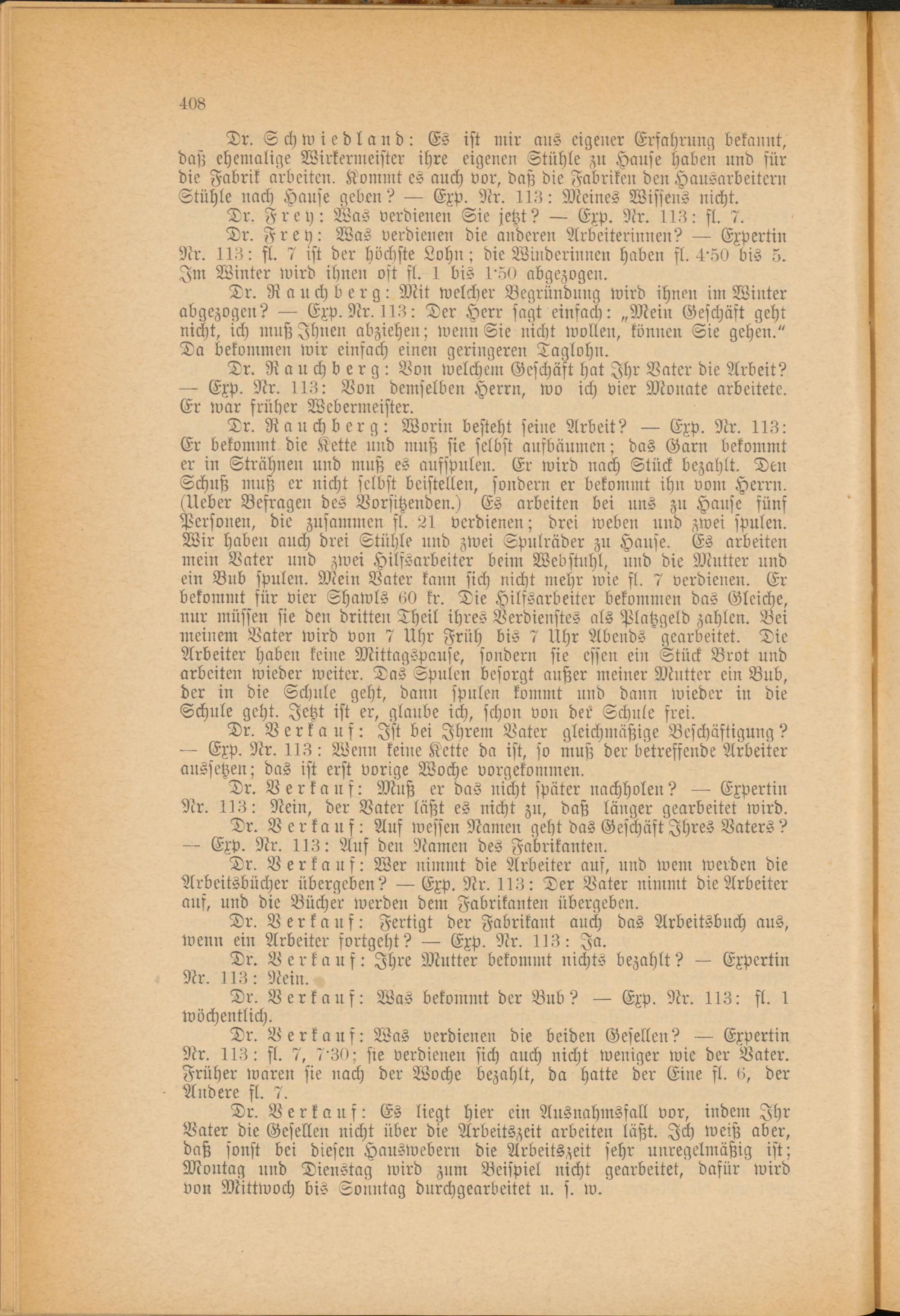 Dr. Rauchberg: Worin besteht feine Arbeit? — Exp. Nr. 113: Er bekommt die Kette und muß sie selbst aufbäumen; das Garn bekommt er in Strähnen und muß es aufspulen. Er wird nach Stück bezahlt. Den Schuß muß er nicht selbst beistellen, sondern er bekommt ihn vom Herrn. (Ueber Befragen des Vorsitzenden.) Es arbeiten bei uns zn Hause fünf Personen, die zusammen fl. 21 verdienen; drei weben und zwei spulen. Wir haben auch drei Stühle und zwei Spulräder zu Hause. Es arbeiten mein Vater und zwei Hilfsarbeiter beim Webstuhl, und die Mutter und ein Bub spulen. Mein Vater kann sich nicht mehr wie fl. 7 verdienen. Er bekommt für vier Shawls 60 kr. Die Hilfsarbeiter bekommen das Gleiche, nur müssen sie den dritten Theil ihres Verdienstes als Platzgeld zahlen. Bei meinem Vater wird von 7 Uhr Früh bis 7 Uhr Abends gearbeitet. Die Arbeiter haben keine Mittagspause, sondern sie essen ein Stück Brot und arbeiten wieder weiter. Das Spulen besorgt außer meiner Mutter ein Bub, der in die Schule geht, dann spulen kommt und dann wieder in die Schule geht. Jetzt ist er, glaube ich, schon von der Schule frei.