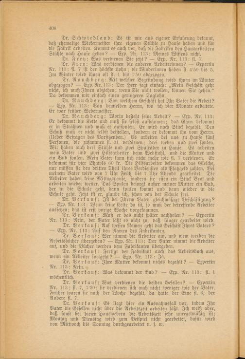 Dr. Verkauf: Es liegt hier ein Ausnahmsfall vor, indem Ihr Vater die Gesellen nicht über die Arbeitszeit arbeiten läßt. Ich weiß aber, daß sonst bei diesen Hauswebern die Arbeitszeit sehr unregelmäßig ist; Montag und Dienstag wird zum Beispiel nicht gearbeitet, dafür wird von Mittwoch bis Sonntag durchgearbeitet u. s. w.
