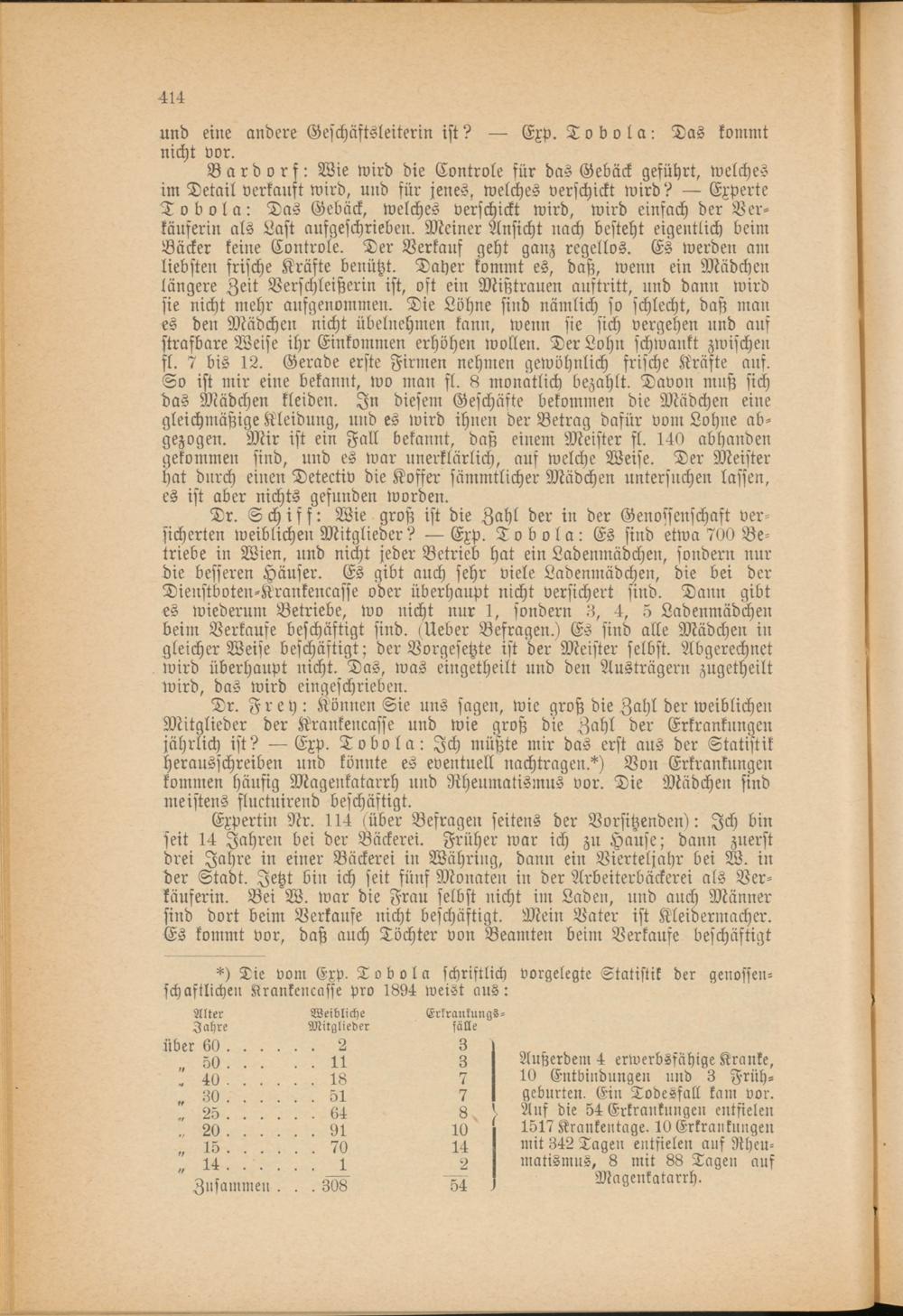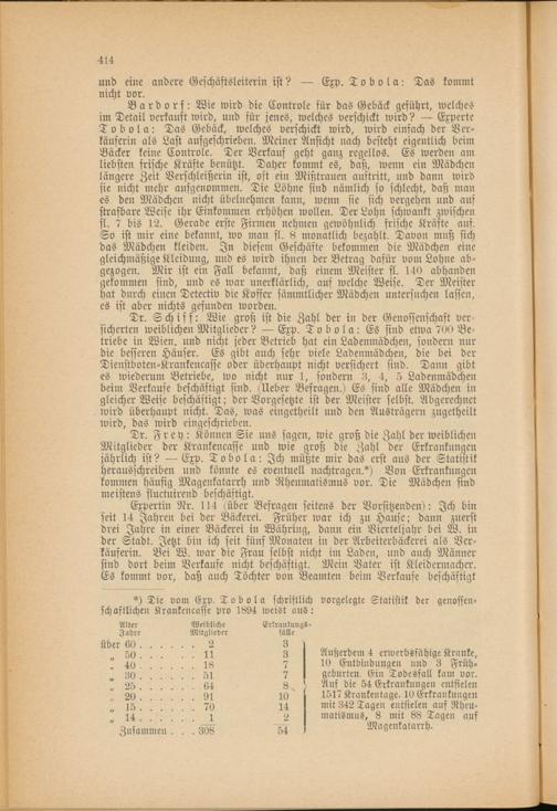 Dr. Schiff: Wie groß ist die Zahl der in der Genossenschaft versicherten weiblichen Mitglieder? — Exp. Tobola: Es sind etwa 700 Betriebe in Wien, und nicht jeder Betrieb hat ein Ladenmädchen, sondern nur die besseren Häuser. Es gibt auch sehr viele Ladenmädchen, die bei der Dienstboten-Krankencasse oder überhaupt nicht versichert sind. Dann gibt es wiederum Betriebe, wo nicht nur 1, sondern 3, 4, 5 Ladenmädchen beim Verkaufe beschäftigt sind. (Ueber Befragen.) Es sind alle Mädchen in gleicher Weise beschäftigt; der Vorgesetzte ist der Meister selbst. Abgerechnet wird überhaupt nicht. Das, was eingetheilt und den Austrägern zugetheilt wird, das wird eingeschrieben.