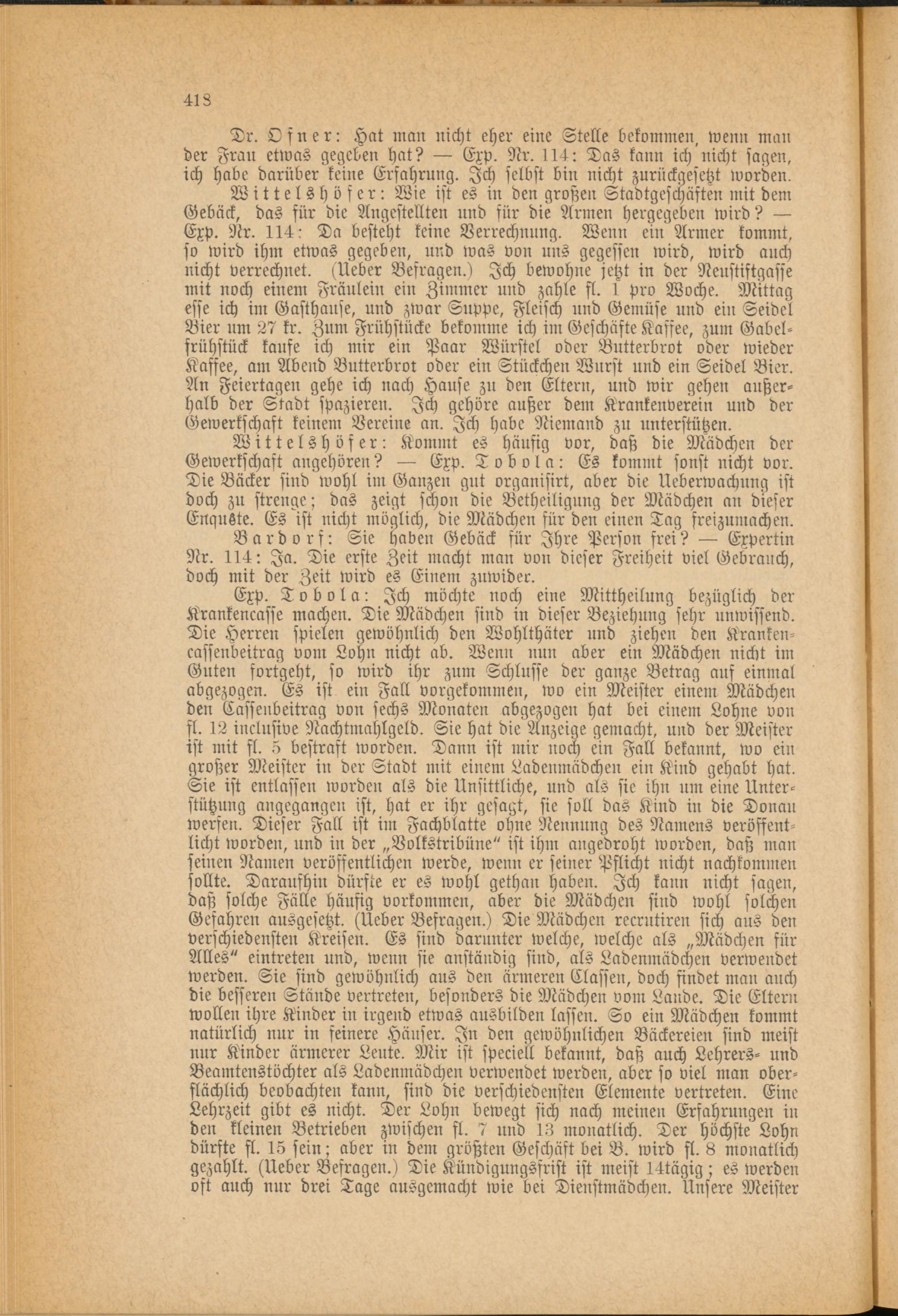 W it t e l s h ö f er: Wie ist es in den großen Stadtgeschästen mit dem Gebäck, das für die Angestellten und für die Armen hergegeben wird? — Exp. Nr. 114: Da besteht keine Verrechnung. Wenn ein Armer kommt, so wird ihm etwas gegeben, und was von uns gegessen wird, wird auch nicht verrechnet. (Ueber Besragen.1 Ich bewohne jetzt in der Neustiftgasse mit noch einem Fräulein ein Zimmer und zahle fl. 1 pro Woche. Mittag esse ich im Gasthause, und zwar Suppe, Fleisch und Gemüse und ein Seidel Bier um 27 kr. Zum Frühstücke bekomme ich im Geschäfte Kaffee, zum Gabelfrühstück kaufe ich mir ein Paar Würstel oder Butterbrot oder wieder Kaffee, am Abend Butterbrot oder ein Stückchen Wurst und ein Seidel Bier. An Feiertagen gehe ich nach Hause zu den Eltern, und wir gehen außerhalb der Stadt spazieren. Ich gehöre außer dem Krankenverein und der Gewerkschaft keinem Vereine an. Ich habe Niemand zu unterstützen.