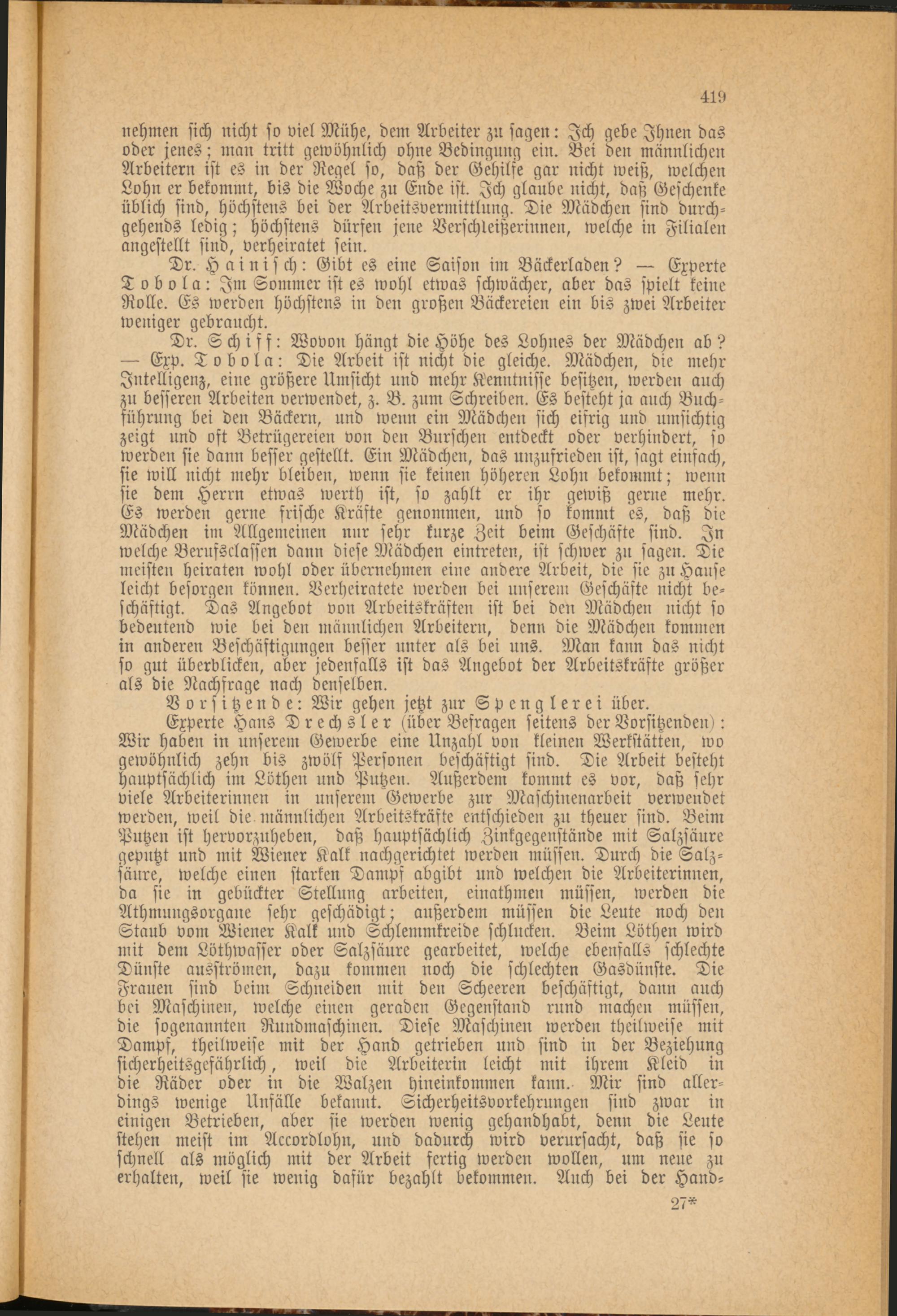 Experte Hans Drechsler (über Befragen seitens der Vorsitzenden»: Wir haben in unserem Gewerbe eine Unzahl von kleinen Werkstätten, wo gewöhnlich zehn bis zwölf Personen beschäftigt sind. Die Arbeit besteht hauptsächlich im Löthen und Putzen. Außerdem kommt es vor, daß sehr viele Arbeiterinnen in unserem Gewerbe zur Maschinenarbeit verwendet werden, weil die männlichen Arbeitskräfte entschieden zu theuer sind. Beim Putzen ist hervorzuheben, daß hauptsächlich Zinkgegenstände mit Salzsäure geputzt und mit Wiener Kalk nachgerichtet werden müssen. Durch die Salzsäure, welche einen starken Dampf abgibt und welchen die Arbeiterinnen, da sie in gebückter Stellung arbeiten, einathmen müssen, werden die Athmungsorgane sehr geschädigt - außerdem müssen die Leute noch den Staub vom Wiener Kalk und schlemmkreide schlucken. Beim Löthen wird mit dem Löthwasser oder Salzsäure gearbeitet, welche ebenfalls schlechte Dünste ausströmen, dazu kommen noch die schlechten Gasdünste. Die Frauen sind beim Schneiden mit den Scheeren beschäftigt, dann auch bei Maschinen, welche einen geraden Gegenstand rund machen müssen, die sogenannten Rundmaschinen. Diese Maschinen werden theilweise mit Dampf, theilweise mit der Hand getrieben und sind in der Beziehung sicherheitsgefährlich, weil die Arbeiterin leicht mit ihrem Kleid in die Räder oder in die Walzen hineinkommen kann. Mir sind allerdings wenige Unfälle bekannt. Sicherheitsvorkehrungen sind zwar in einigen Betrieben, aber sie werden wenig gehandhabt, denn die Leute stehen meist im Accordlohn, und dadurch wird verursacht, daß sie so schnell als möglich mit der Arbeit fertig werden wollen, um neue zu erhalten, weil sie wenig dafür bezahlt bekommen. Auch bei der Hand-