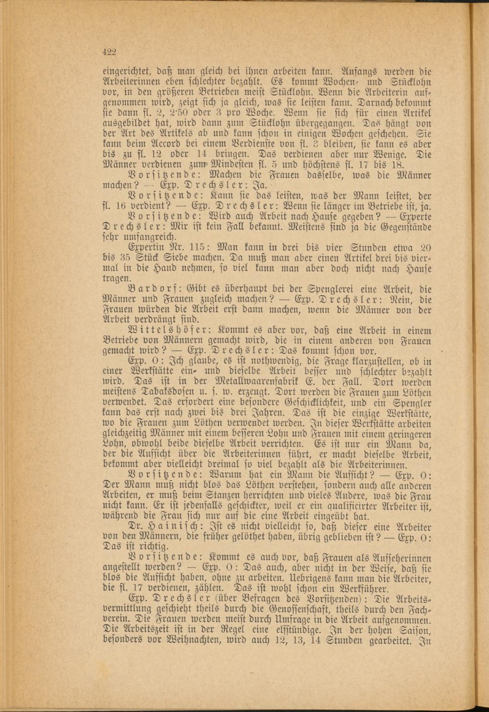 Exp. 0: Ich glaube, es ist nothwendig, die Frage klarzustellen, ob in einer Werkstätte ein- und dieselbe Arbeit besser und schlechter bezahlt wird. Das ist in der Metallwaarenfabrik E. der Fall. Dort werden meistens Tabaksdosen u. s. w. erzeugt. Dort werden die Frauen zum Löthen verwendet. Das erfordert eine besondere Geschicklichkeit, und ein Spengler kann das erst nach zwei bis drei Jahren. Das ist die einzige Werkstütte, wo die Frauen zum Löthen verwendet werden. In dieser Werkstätte arbeiten gleichzeitig Männer mit einem besseren Lohn und Frauen mit einem geringeren Lohn, obwohl beide dieselbe Arbeit verrichten. Es ist nur ein Mann da, der die Aufsicht über die Arbeiterinnen führt, er macht dieselbe Arbeit, bekommt aber vielleicht dreimal so viel bezahlt als die Arbeiterinnen.