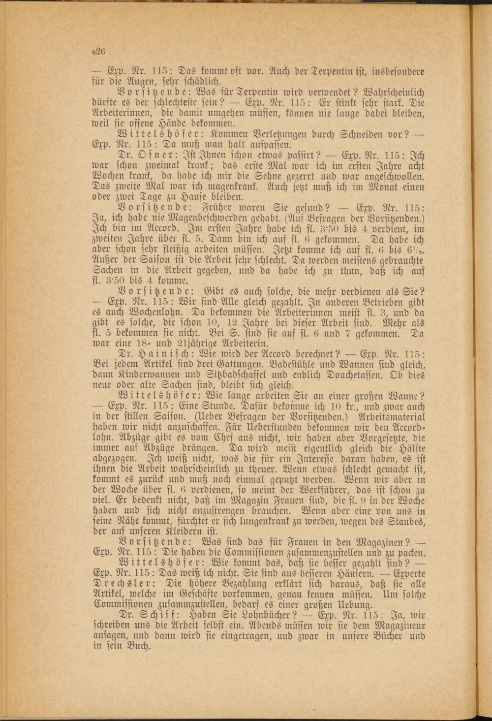 Vorsitzende: Früher waren Sie gesund? — Exp. Nr. 115: Ja, ich habe nie Magenbeschwerden gehabt. (Aus Befragen der Vorsitzenden.) Ich bin im Accord. Im ersten Jahre habe ich fl. 3'50 bis 4 verdient, im zweiten Jahre über fl. 5. Dann bin ich auf fl. 6 gekommen. Da habe ich aber schon lehr fleißig arbeiten müssen. Jetzt komme ich auf fl. 0 bis 6tzr. Außer der Saison ist die Arbeit sehr schlecht. Da werden meistens gebrauchte Sachen in die Arbeit gegeben, und da habe ich zu thun, daß ich auf fl. 3'50 bis 4 komme.