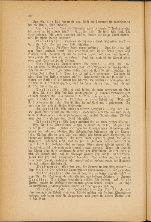 Dr. Osner: Ist Ihnen schon etwas passirt? — Exp. Nr. 115: Ich war schon zweimal krank; das erste Mal war ich im ersten Jahre acht Wochen krank, da habe ich mir die Sehne gezerrt und war angeschwollen. Das zweite Mal war ich magenkrank. Auch jetzt muß ich im Monat einen oder zwei Tage zn Hause bleiben.