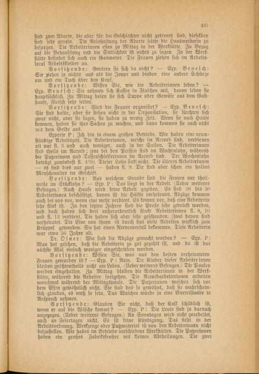 Vorsitzende: Wissen Sie, wie die Arbeiterinnen leben? — Exp. Benesch: Sie nehmen sich Kaffee in Flaschen mit, davon leben sie hauptsächlich. Zu Mittag holen sie sich Suppe oder Gemüse aus dem Gasthause, Fleisch sehr selten.