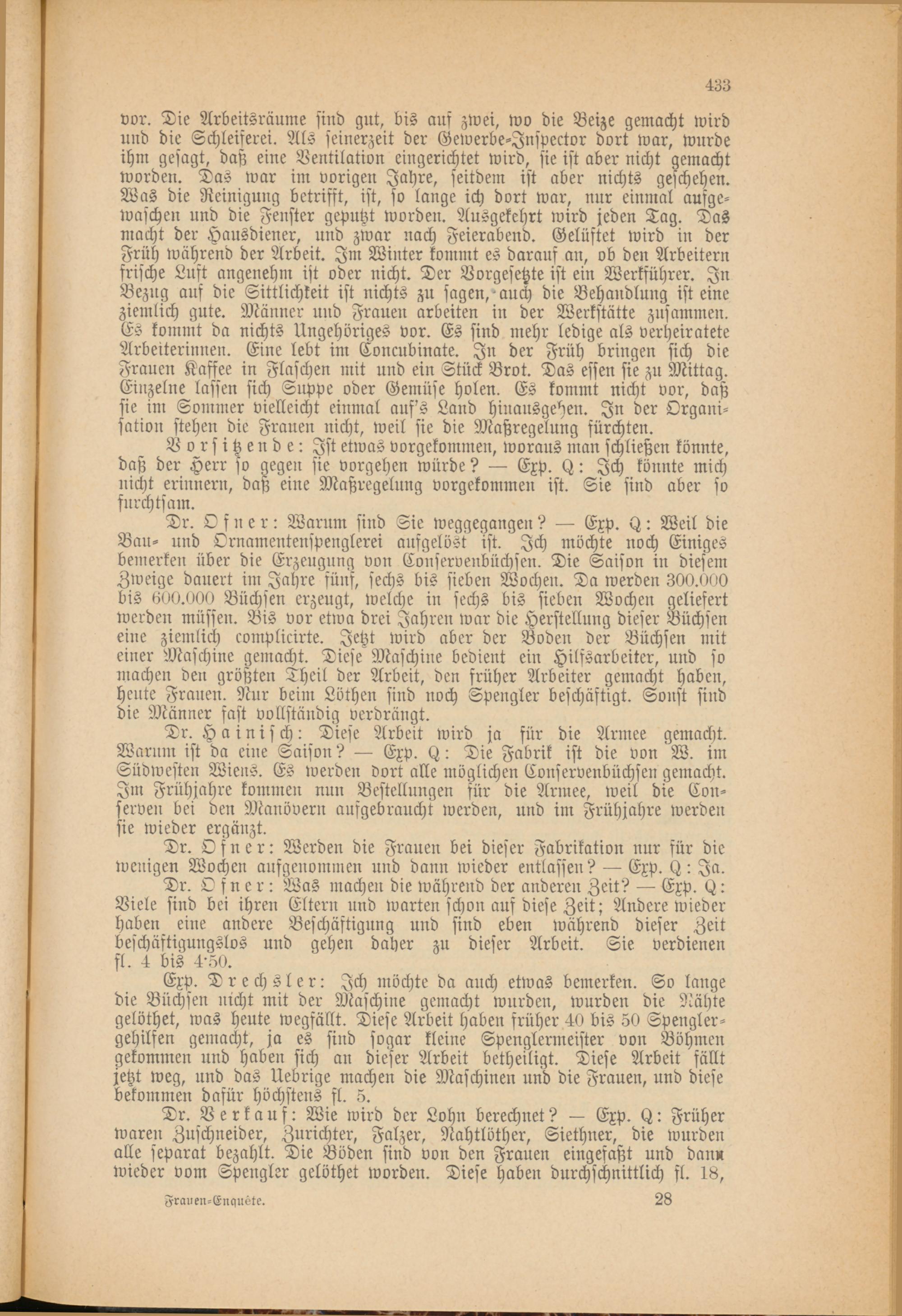 Dr. Ofner: Warum sind Sie weggegangen? — Exp. H: Weil die Ban- und Ornamentenspenglerei aufgelöst ist. Ich möchte noch Einiges bemerken über die Erzeugung von Conservenbüchsen. Die Saison in diesem Zweige dauert im Jahre fünf, sechs bis sieben Wochen. Da werden 300.000 bis 000.000 Büchsen erzeugt, welche in sechs bis sieben Wochen geliefert werden müssen. Bis vor etwa drei Jahren war die Herstellung dieser Büchsen eine ziemlich complicirte. Jetzt wird aber der Boden der Büchsen mit einer Maschine gemacht. Diese Maschine bedient ein Hilfsarbeiter, und so machen den größten Theil der Arbeit, den früher Arbeiter gemacht haben, heute Frauen. Nur beim Löthen sind noch Spengler beschäftigt. Sonst sind die Männer fast vollständig verdrängt.