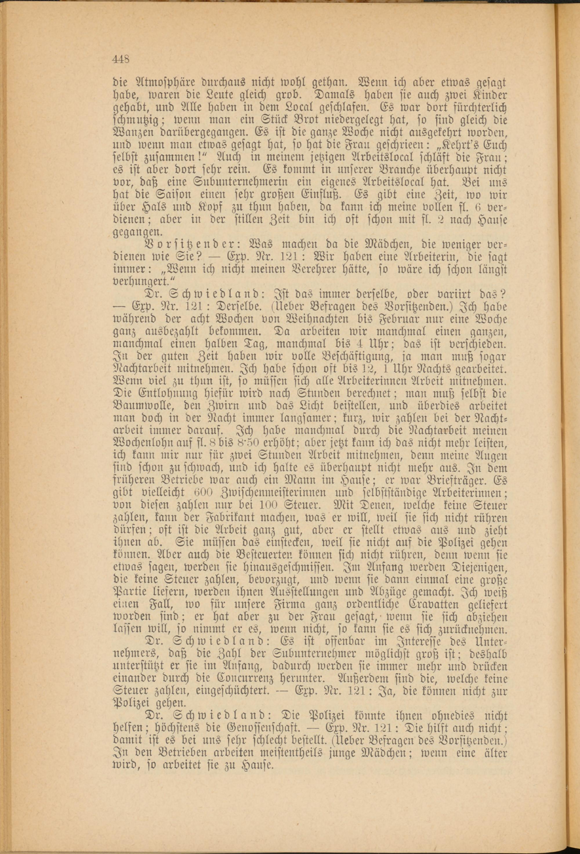Dr. Schwiedland: Ist das immer derselbe, oder variirt das? — Exp. Nr. 121: Derselbe. «Ueber Befragen des Vorsitzenden.) Ich habe während der acht Wochen von Weihnachten bis Februar nur eine Woche ganz ausbezahlt bekommen. Da arbeiten wir manchmal einen ganzen, manchmal einen halben Tag, manchmal bis 4 Uhr; das ist verschieden. In der guten Zeit haben wir volle Beschäftigung, ja man muß sogar Nachtarbeit mitnehmen. Ich habe schon oft bis 12, 1 Uhr Nachts gearbeitet. Wenn viel zu thun ist, so müssen sich alle Arbeiterinnen Arbeit mitnehmen. Die Entlohnung hiefür wird nach Stunden berechnet; man muß selbst die Baumwolle, den Zwirn und das Licht beistellen, und überdies arbeitet rnan doch in der Nacht immer langsamer; kurz, wir zahlen bei der Nachtarbeit immer darauf. Ich habe manchmal durch die Nachtarbeit meinen Wochenlohn auf fl. 8bis 8'50 erhöht; aber jetzt kann ich das nicht mehr leisten, ich kaun mir nur für zwei Stunden Arbeit mitnehmen, denn meine Augen sind schon zu schwach, und ich halte es überhaupt nicht mehr aus. In dem früheren Betriebe war auch ein Mann im Hause; er war Briefträger. Es gibt vielleicht 600 Zwischenmeisterinnen und selbstständige Arbeiterinnen; von diesen zahlen nur bei 100 Steuer. Mit Denen, welche keine Steuer zahlen, kann der Fabrikant machen, was er will, weil sie sich nicht rühren dürfen; oft ist die Arbeit ganz gut, aber er stellt etwas aus und zieht ihnen ab. Sie müssen das einstecken, weil sie nicht aus die Polizei gehen können. Aber auch die Besteuerten können sich nicht rühren, denn wenn sie etwas sagen, werden sie hinausgeschmissen. Im Anfang werden Diejenigen, die keine Steuer zahlen, bevorzugt, und wenn sie dann einmal eine große Partie liefern, werden ihnen Ausstellungen und Abzüge gemacht. Ich weiß einen Fall, wo für unsere Firma ganz ordentliche Cravatten geliefert worden sind; er hat aber zu der Frau gesagt, wenn sie sich abziehen lassen will, so nimmt er es, wenn nicht, so kann sie es sich zurücknehmen.