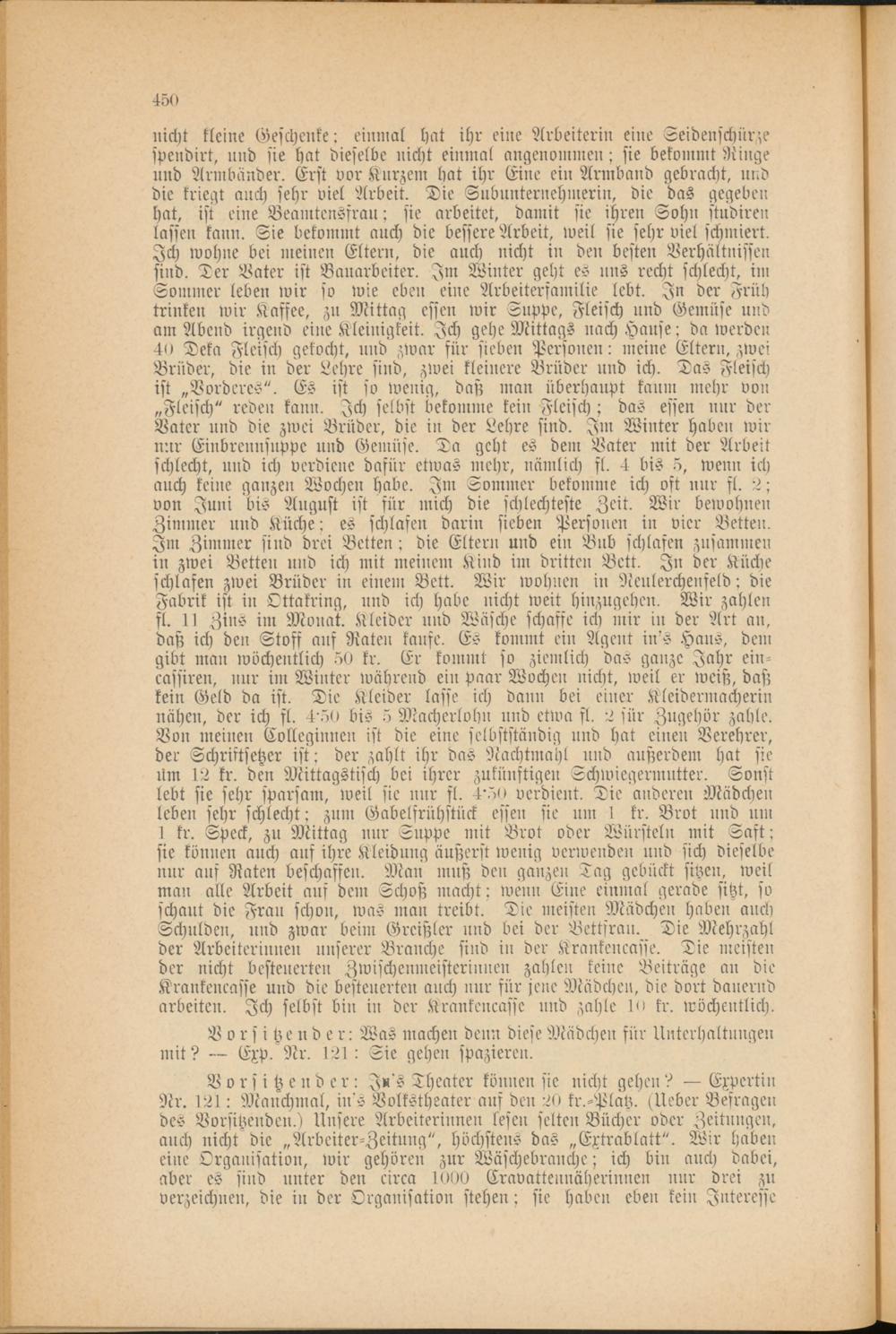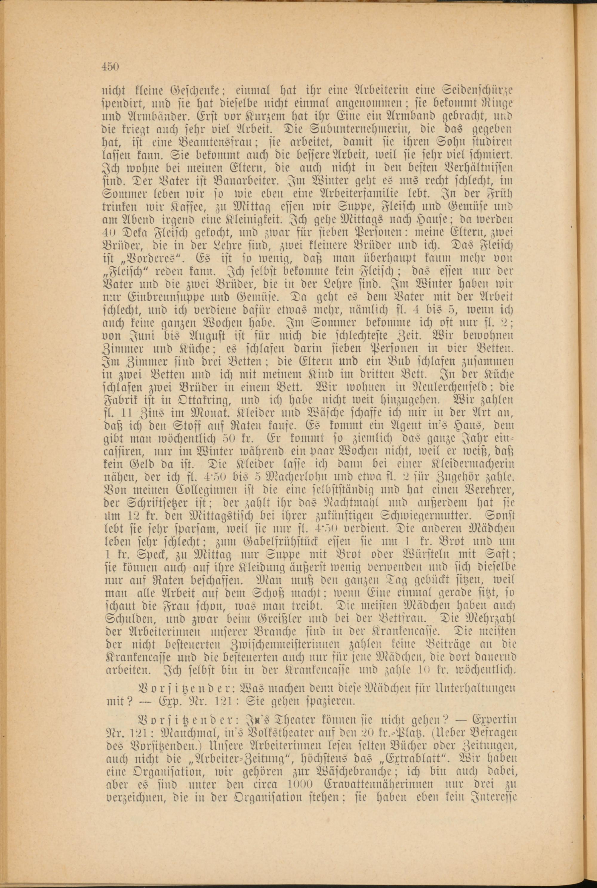 Vorsitzender: In's Theater können sie nicht gehen? — Expertin Nr. I2l: Manchmal, in's Volkstheater aus den 20 kr.-Platz. Zleber Befragen des Vorsitzenden.) Unsere Arbeiterinnen lesen selten Bücher oder Zeitungen, auch nicht die „Arbeiter-Zeitung", höchstens das „Extrablatt". Wir haben eine Organisation, wir gehören zur Wäschebranche; ich bin auch dabei, aber es sind unter den circa 1000 Cravattennäherinnen nur drei zu verzeichnen, die in der Organisation stehen; sie haben eben kein Interesse