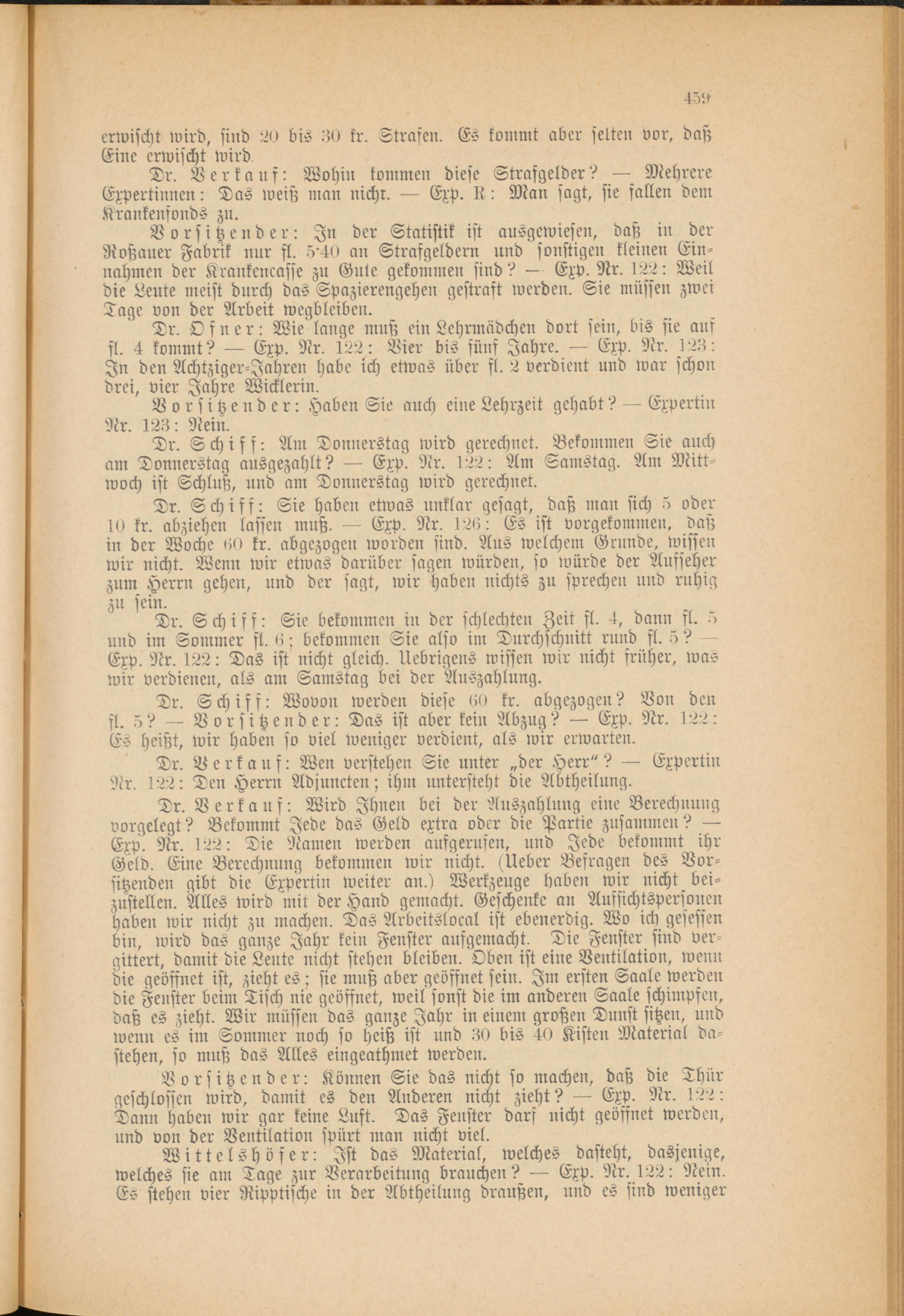 Dr. Schiff: Sie bekommen in der schlechten Zeit fl. 4, dann fl. -> und im Sommer fl. 6; bekommen Sie also im Durchschnitt rund fl. 3 ? Exp. Nr. 122: Das ist nicht gleich. Uebrigens wissen wir nicht früher, was wir verdienen, als am Samstag bei der Auszahlung.