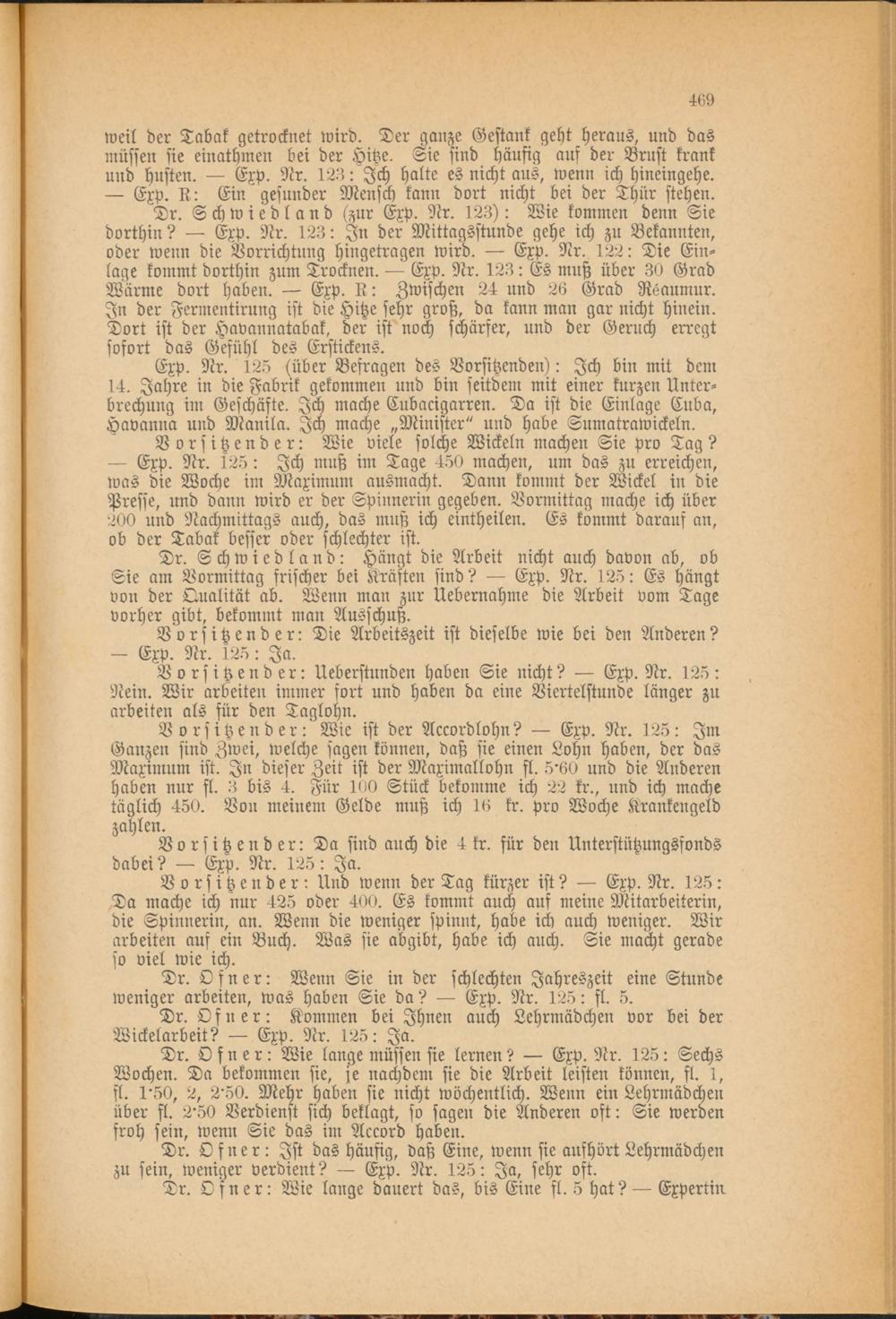 Vorsitzender: Wie ist der Accordlohn? — Exp. Nr. 125: Im Ganzen sind Zwei, welche sagen können, daß sie einen Lohn haben, der das Maximum ist. In dieser Zeit ist der Maximallohn st. 5'60 und die Anderen haben nur st. 3 bis 4. Für 100 Stück bekomme ich 22 kr., und ich mache täglich 450. Von meinem Gelde muß ich 16 kr. pro Woche Krankengeld zahlen.
