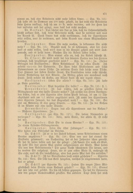 Dr. Ofner: Es wird wohl bei den feineren Sorten von den Herren verlangt, daß sorgfältiger gearbeitet wird? — Exp. Nr. 125: Ja. (Ueber Befragen des Vorsitzenden.) Mein Arbeitslocal ist im ersten Stocke. Ich arbeite vis-L-vis der Spinnerin. Da sitzen sechs Wicklerinnen und sechs Spinnerinnen an einem Tische. In unserem Saale sind solche neun Tische. Das Zimmer hat sieben Fenster Front. Die Ventilation wäre nicht schlecht. Unsere Abtheilung hat drei Aborte. Zu Mittag gehen wir manchmal nach Hause. Früh nehme ich Kaffee, am Abend kaufe ich mir irgend etwas.