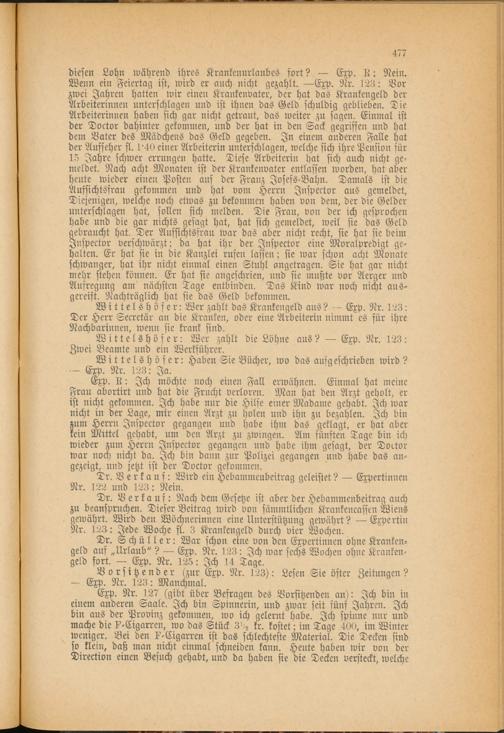 diesen Lohn während ihres Krankenurlaubes fort? — Exp. U: Nein. Wenn ein Feiertag ist, wird er auch nicht gezahlt. —Exp. Nr. l23: Vor zwei Jahren hatten wir einen Krankenvater, der hat das Krankengeld der Arbeiterinnen unterschlagen und ist ihnen das Geld schuldig geblieben. Die Arbeiterinnen haben sich gar nicht getraut, das weiter zu sagen. Einmal ist der Doctor dahinter gekommen, und der hat in den Sack gegriffen und hat dem Vater des Mädchens das Geld gegeben. In einem anderen Falle hat der Aufseher st. U40 einer Arbeiterin unterschlagen, welche sich ihre Pension für 15 Jahre schwer errungen hatte. Diese Arbeiterin hat sich auch nicht gemeldet. Nach acht Monaten ist der Krankenvater entlassen worden, hat aber heute wieder einen Posten auf der Franz Josefs-Bahn. Damals ist die Aufsichtsfrau gekommen und hat vom Herrn Jnspector aus gemeldet, Diejenigen, welche noch etwas zu bekommen haben von dem, der die Gelder unterschlagen hat, sollen sich melden. Die Frau, von der ich gesprochen habe und die gar nichts gesagt hat, hat sich gemeldet, weil sie das Geld gebraucht hat. Der Aufsichtsfrau war das aber nicht recht, sie hat sie beim Jnspector verschwärzt; da hat ihr der Jnspector eine Moralpredigt gehalten. Er hat sie in die Kanzlei rufen lassen; sie war schon acht Monate schwanger, hat ihr nicht einmal einen Stuhl angetragen. Sie hat gar nicht mehr stehen können. Er hat sie angeschrien, und sie mußte vor Aerger nnd Aufregung am nächsten Tage entbinden. Das Kind war noch nicht ausgereift. Nachträglich hat sie das Geld bekommen.