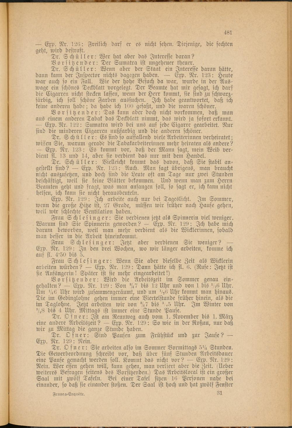 Dr. Schüller: Vielleicht kommt das davon, daß Sie stabil angestellt sind? — Exp. Nr. 123: Auch. Man sagt übrigens, man braucht nicht auszusetzen, und doch sind die Leute oft am Tage nur zwei Stunden beschäftigt, weil sie keine Blätter bekommen. Und wenn man zum Herrn Beamten geht und fragt, was man anfangen soll, so sagt er, ich kann nicht helfen, ich kann sie nicht heransbeuteln.