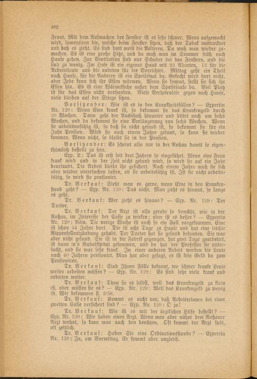 Dr. Verkauf: Der Arzt ist also gerade so bemüht, wie in der Roßau, im Interesse der Casse zu wirken; oder ist es besser? — Expertin Nr. 129: Nein. Die vorige Woche ist auch so ein Fall vorgekommen. Eine ist schon 44 Jahre dort. Die ist acht Tage zu Hause und hat eine leichte Rippenfellentzündung gehabt. Der Doctor hat sie gesund befunden. Sie war aber nicht gesund. Sie ist in die Fabrik gegangen, hat zwei Tage gearbeitet, ist dann in's Rudolsspital gekommen, und da hat der Professor sie untersucht, und sie war sehr krank. In einer anderen Arbeit werden die Leute nach 40 Jahren pensionirt. Man hat aber gesagt, es ist kein Geld da zum Pensioniren.