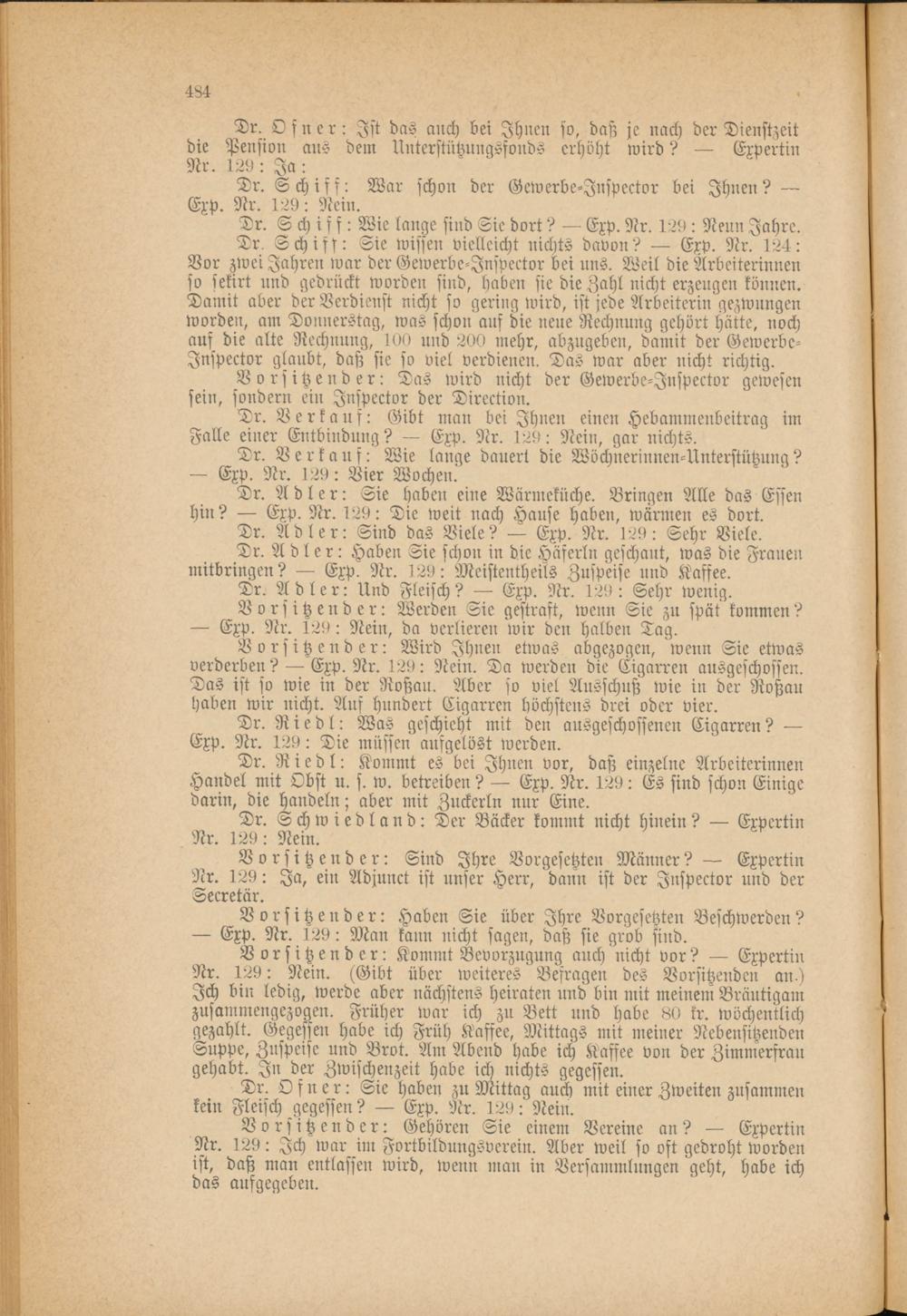 Dr. Riedl: Kommt es bei Ihnen vor, daß einzelne Arbeiterinnen Handel mit Obst u. s. w. betreiben? — Exp. Nr. 129: Es sind schon Einige darin, die handeln; aber mit Zuckerln nur Eine.