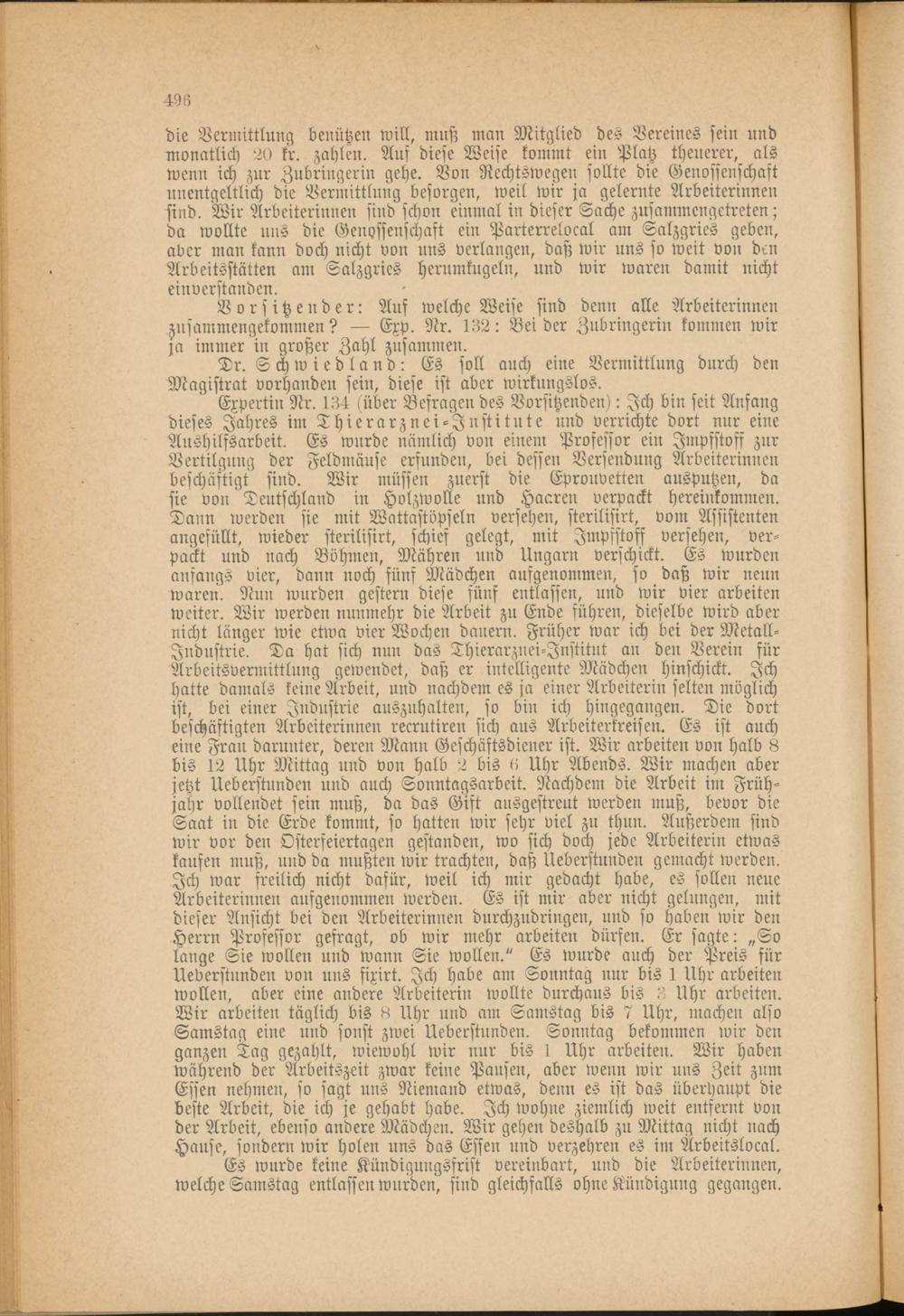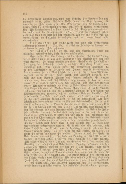 Expertin Nr. 134 «über Befragen des Vorsitzenden): Ich bin seit Anfang dieses Jahres im Thierarznei-Jnstitute und verrichte dort nur eine Aushilfsarbeit. Es wurde nämlich von einen: Professor ein Impfstoff zur Vertilgung der Feldmäuse erfunden, bei dessen Versendung Arbeiterinnen beschäftigt sind. Wir müssen zuerst die Eprouvetten ausputzen, da sie von Deutschland in Holzwolle und Haaren verpackt hereinkommen. Darm werden sie mit Wattastöpseln versehen, sterilisirt, von: Assistenten angefüllt, wieder sterilisirt, schief gelegt, mit Impfstoff versehen, verpackt und nach Böhmen, Mähren und Ungarn verschickt. Es wurden anfangs vier, dann noch fünf Mädchen aufgenommen, so daß wir nenn waren. Nun wurden gestern diese fünf entlassen, und wir vier arbeiten weiter. Wir werden nunmehr die Arbeit zu Ende führen, dieselbe wird aber nicht länger wie etwa vier Wochen dauern. Früher war ich bei der Metall- Industrie. Da hat sich nun das Thierarznei-Jnstitut an den Verein für Arbeitsvermittlung gewendet, daß er intelligente Mädchen hinschickt. Ich hatte damals keine Arbeit, und nachdem es ja einer Arbeiterin selten möglich ist, bei einer Industrie auszuhalten, so bin ich hingegangen. Die dort beschäftigten Arbeiterinnen recrutiren sich aus Arbeiterkreisen. Es ist auch eine Frau darunter, deren Mann Geschäftsdiener ist. Wir arbeiten von halb 8 bis 12 Uhr Mittag und von halb 2 bis 0 Uhr Abends. Wir machen aber jetzt Ueberstunden und auch Sonntagsarbeit. Nachdem die Arbeit in: Frühjahr vollendet sein muß, da das Gift ausgestreut werden muß, bevor die Saat in die Erde kommt, so hatten wir sehr viel zu thun. Außerdem sind wir vor den Osterfeiertagen gestanden, wo sich doch jede Arbeiterin etwas kaufen muß, und da mußten wir trachten, daß Ueberstunden gemacht werden. Ich war freilich nicht dafür, weil ich mir gedacht habe, es sollen neue Arbeiterinnen aufgenommen werden. Es ist mir aber nicht gelungen, mit dieser Ansicht bei den Arbeiterinnen durchzudrängen, und so haben wir den Herrn Professor gefragt, ob wir mehr arbeiten dürfen. Er sagte: „So lange Sie wollen und wann Sie wollen." Es wurde auch der Preis für Ueberstunden von uns fixirt. Ich habe am Sonntag nur bis 1 Uhr arbeiten wollen, aber eine andere Arbeiterin wollte durchaus bis 3 Uhr arbeiten. Wir arbeiten täglich bis 8 Uhr und an: Samstag bis 7 Uhr, machen also Samstag eine und fönst zwei Ueberstunden. Sonntag bekommen wir den ganzen Tag gezahlt, wiewohl wir nur bis 1 Uhr arbeiten. Wir haben während der Arbeitszeit zwar keine Pausen, aber wenn wir uns Zeit zum Essen nehmen, so sagt uns Niemand etwas, denn es ist das überhaupt die beste Arbeit, die ich je gehabt habe. Ich wohne ziemlich weit entfernt von der Arbeit, ebenso andere Mädchen. Wir gehen deshalb zu Mittag nicht nach Hause, sondern wir holen uns das Essen und verzehren es in: Arbeitslocal.