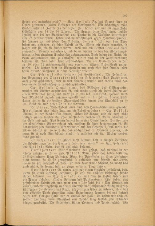 Arbeit viel ausgesetzt wird? Exp. Pollak: Ja, das ist uns schon zu Ohren gekommen. (Ueber Befragen des Vorsitzenden.'! Wir beschäftigen keine Kinder unter 14 Jahren. In der letzten Zeit hatten wir nur 60 jugendliche Hilfskräfte von 14 bis 16 Jahren. Die Frauen benn Gonffriren, welche ähnlich wie bei der Bnchdruckerei das Papier in die Maschine hineinlegen und es herausnehmen, haben Schutzvorrichtungen gegen Handverletzungen. Es kommen zu uns jeden Tag Arbeiter, die um 7 Uhr vor dem Thor- stehen und anfragen, ob keine Arbeit da ist. Wenn wir Leute brauchen, so fragen wir sie, wo sie früher waren, weil wir am liebsten Leute aus einer verwandten Branche aufnehmen, und dann werden sie von den Abtheilungs­leitern in den einzelnen Stockwerken aufgenommen. Diese haben das Recht, die Leute aufzunehmen und zu entlassen, wie es auch in der Fabriksordnung bestimmt ist. Wir haben keine Lehrmädchen. Die neu Eintretenden werden zu 10 oder 12 zusammengesetzt und von einer älteren Arbeitskraft unter­wiesen. Die letztere steht im Wochenlohn und muß eben jede Stunde oder halbe Stunde nachsehen, wie die Neulinge arbeiten.