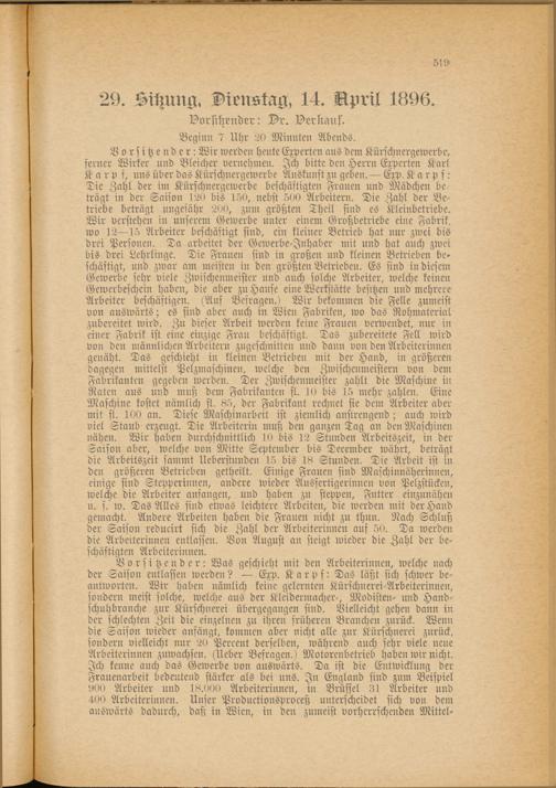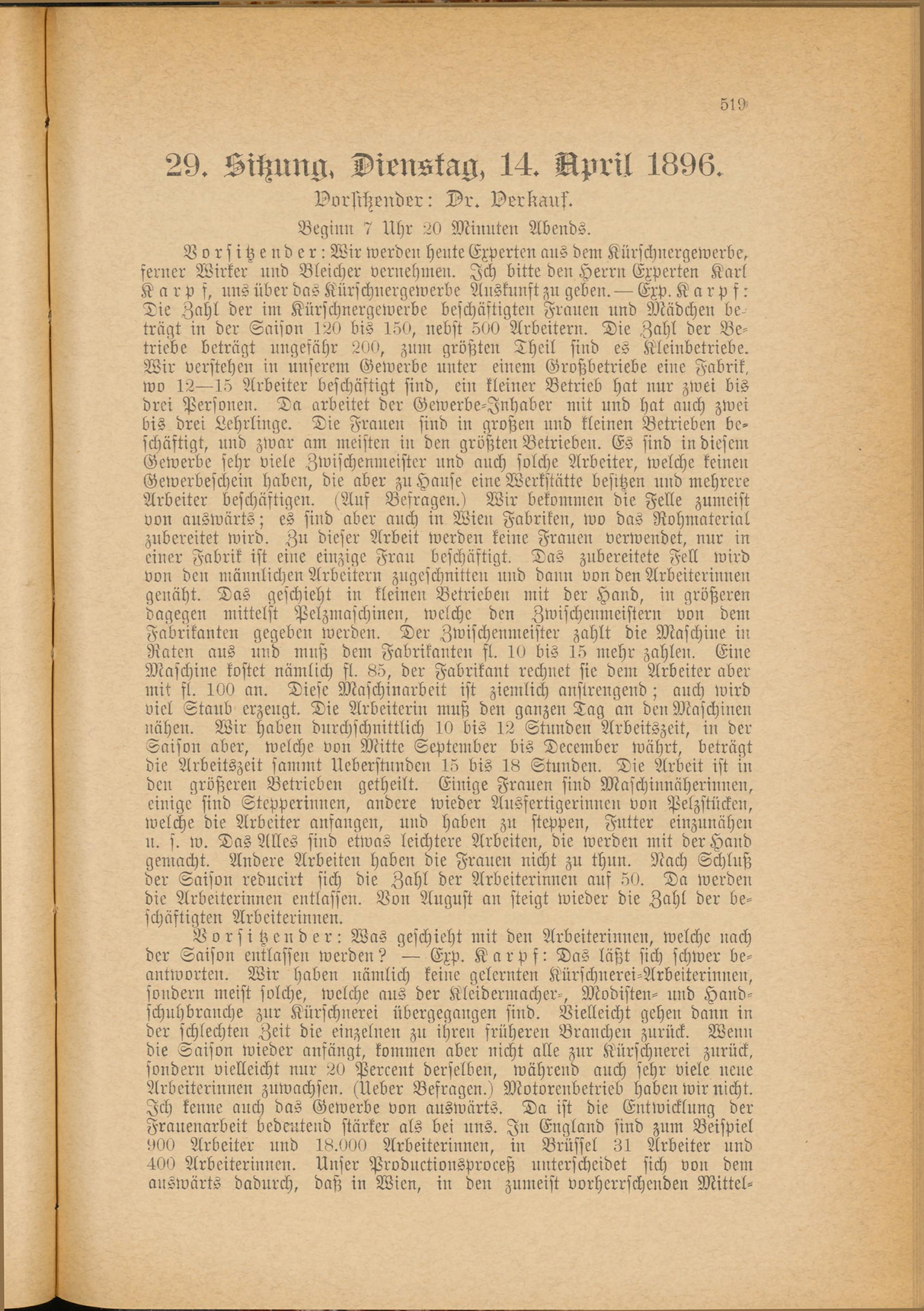 Vorsitzender: Was geschieht mit den Arbeiterinnen, welche nach der Saison entlassen werden? — Exp. Karpf: Das läßt sich schwer beantworten. Wir haben nämlich keine gelernten Kürschnerei-Arbeiterinnen, sondern meist solche, welche aus der Kleidermacher-, Modisten- und Handschuhbranche zur Kürschnerei übergegangen sind. Vielleicht gehen dann in der schlechten Zeit die einzelnen zu ihren früheren Branchen zurück. Wenn die Saison wieder anfängt, kommen aber nicht alle zur Kürschnerei zurück, sondern vielleicht nur 20 Percent derselben, während auch sehr viele ueue Arbeiterinnen zuwachsen. (Ueber Befragen.) Motorenbetrieb haben wir nicht. Ich kenne auch das Gewerbe von auswärts. Da ist die Entwicklung der Frauenarbeit bedeutend stärker als bei uns. In England sind zum Beispiel 900 Arbeiter und 18.000 Arbeiterinnen, in Brüssel 31 Arbeiter und 400 Arbeiterinnen. Unser Productionsproceß unterscheidet sich von dem auswärts dadurch, daß in Wien, in den zumeist vorherrschenden Mittel-