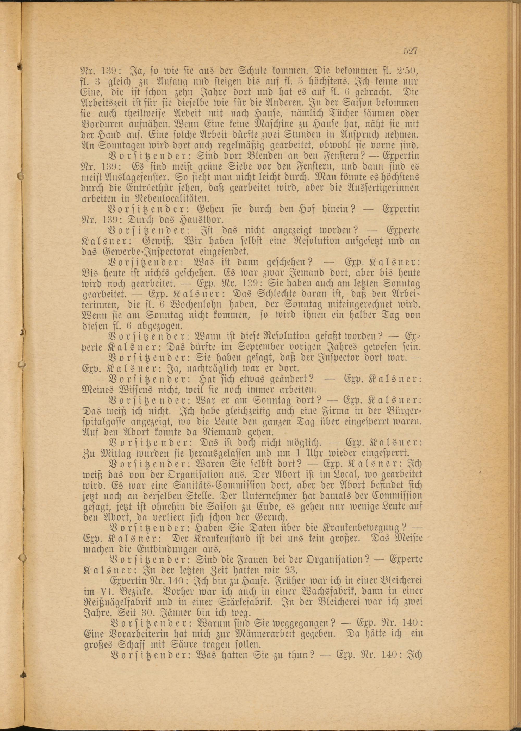 Vorsitzender: Was ist dann geschehen? — Exp. Kalsner: Bis heute ist nichts geschehen. Es war zwar Jemand dort, aber bis heute wird noch gearbeitet. — Exp. Nr. 139: Sie haben auch am letzten Sonntag gearbeitet. — Exp. Kalsner: Das Schlechte daran ist, daß den Arbeiterinnen, die sl. 6 Wochenlohn haben, der Sonntag miteingerechnet wird. Wenn sie am Sonntag nicht kommen, so wird ihnen ein halber Tag von diesen fl. 6 abgezogen.