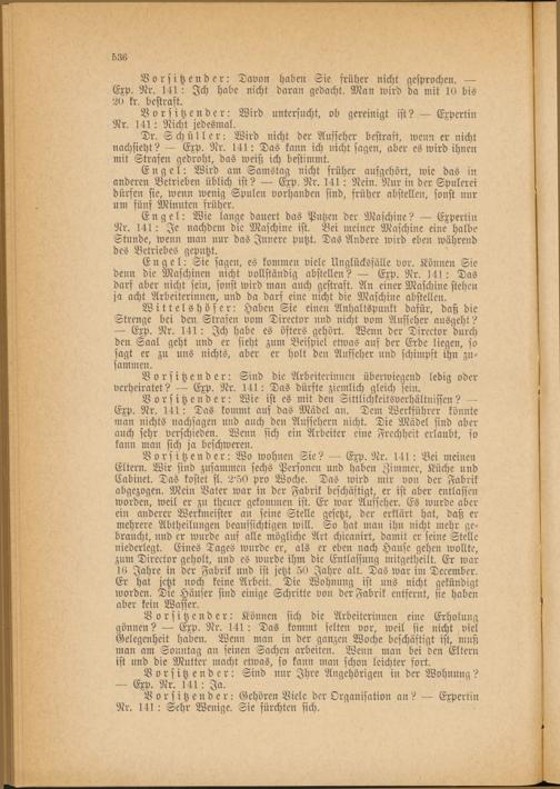 Engel: Sie sagen, es kommen viele Unglücksfälle vor. Können Sie denn die Maschinen nicht vollständig abstellen? Exp. Nr. 141: Das darf aber nicht sein, sonst wird man auch gestraft. An einer Maschine stehen ja acht Arbeiterinnen, und da darf eine nicht die Maschine abstellen.
