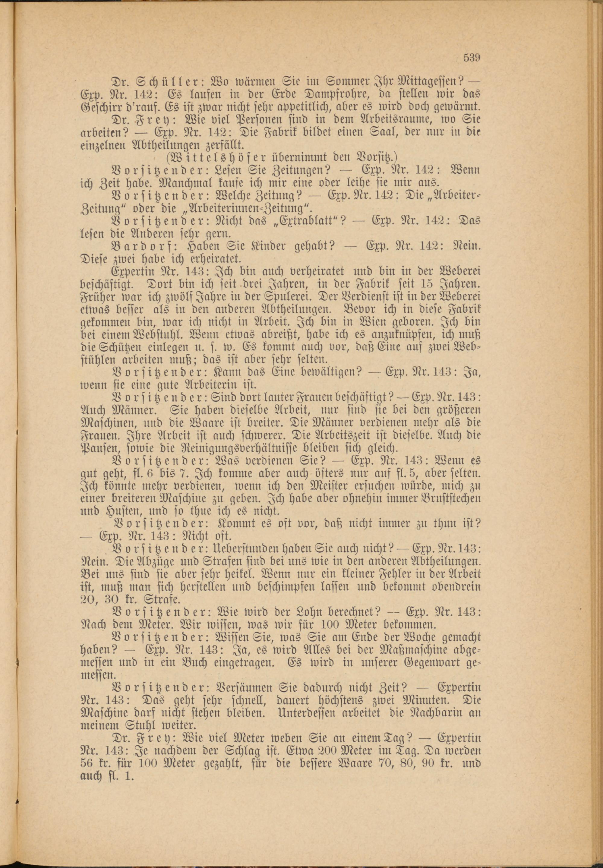 Vorsitzender: Was verdienen Sie? Exp. Nr. 143: Wenn es gut geht, fl. 6 bis 7. Ich komme aber auch öfters nur auf fl. 5, aber selten. Ich könnte mehr verdienen, wenn ich den Meister ersuchen würde, mich zu einer breiteren Maschine zu geben. Ich habe aber ohnehin immer Bruststechen und Husten, und so thue ich es nicht.