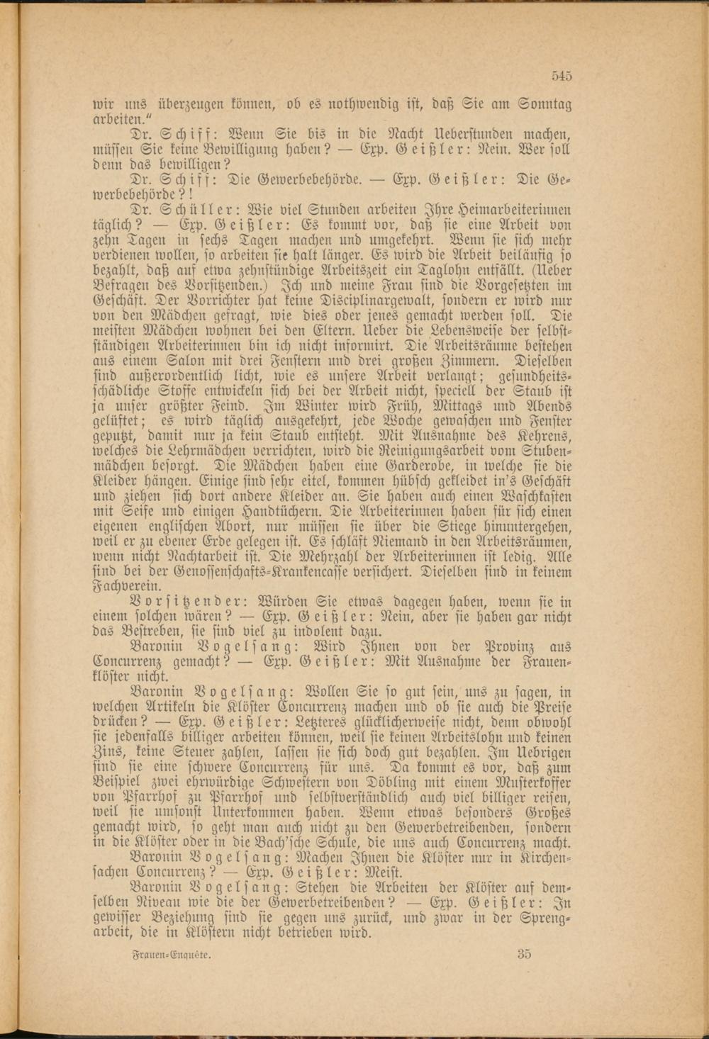 Dr. Schüller: Wie viel Stunden arbeiten Ihre Heimarbeiterinnen täglich? Exp. Geißler: Es kommt vor, daß sie eine Arbeit von zehn Tagen in sechs Tagen machen und umgekehrt. Wenn sie sich mehr verdienen wollen, so arbeiten sie halt länger. Es wird die Arbeit beiläufig w bezahlt, daß auf etwa zehnstündige Arbeitszeit ein Taglohn entfällt. (Ueber Befragen des Vorsitzenden.) Ich und meine Frau sind die Vorgesetzten im Geschäft. Der Vorrichter hat keine Disciplinargewalt, sondern er wird nur von den Mädchen gefragt, wie dies oder jenes gemacht werden soll. Die meisten Mädchen wohnen bei den Eltern. Ueber die Lebensweise der selbst- ständigen Arbeiterinnen bin ich nicht informirt. Die Arbeitsräume bestehen aus einem Salon mit drei Fenstern und drei großen Zimmern. Dieselben sind außerordentlich licht, wie es unsere Arbeit verlangt; gesundheits­schädliche Stoffe entwickeln sich bei der Arbeit nicht, speciell der Staub ist ja unser größter Feind. Im Winter wird Früh, Mittags und Abends gelüftet; es wird täglich ausgekehrt, jede Woche gewaschen und Fenster geputzt, damit nur ja kein Staub entsteht. Mit Ausnahme des Kehrens, welches die Lehrmädchen verrichten, wird die Reinigungsarbeit vom Stuben­mädchen besorgt. Die Mädchen haben eine Garderobe, in welche sie die Kleider hängen. Einige sind sehr eitel, kommen hübsch gekleidet in's Geschäft und ziehen sich dort andere Kleider an. Sie haben auch einen Waschkasten mit Seife und einigen Handtüchern. Die Arbeiterinnen haben für sich einen eigenen englischen Abort, nur müssen sie über die Stiege hinuntergehen, weil er zu ebener Erde gelegen ist. Es schläft Niemand in den Arbeitsräumen, wenn nicht Nachtarbeit ist. Die Mehrzahl der Arbeiterinnen ist ledig. Alle sind bei der Genossenschafts-Krankencasse versichert. Dieselben sind in keinem Fachverein.