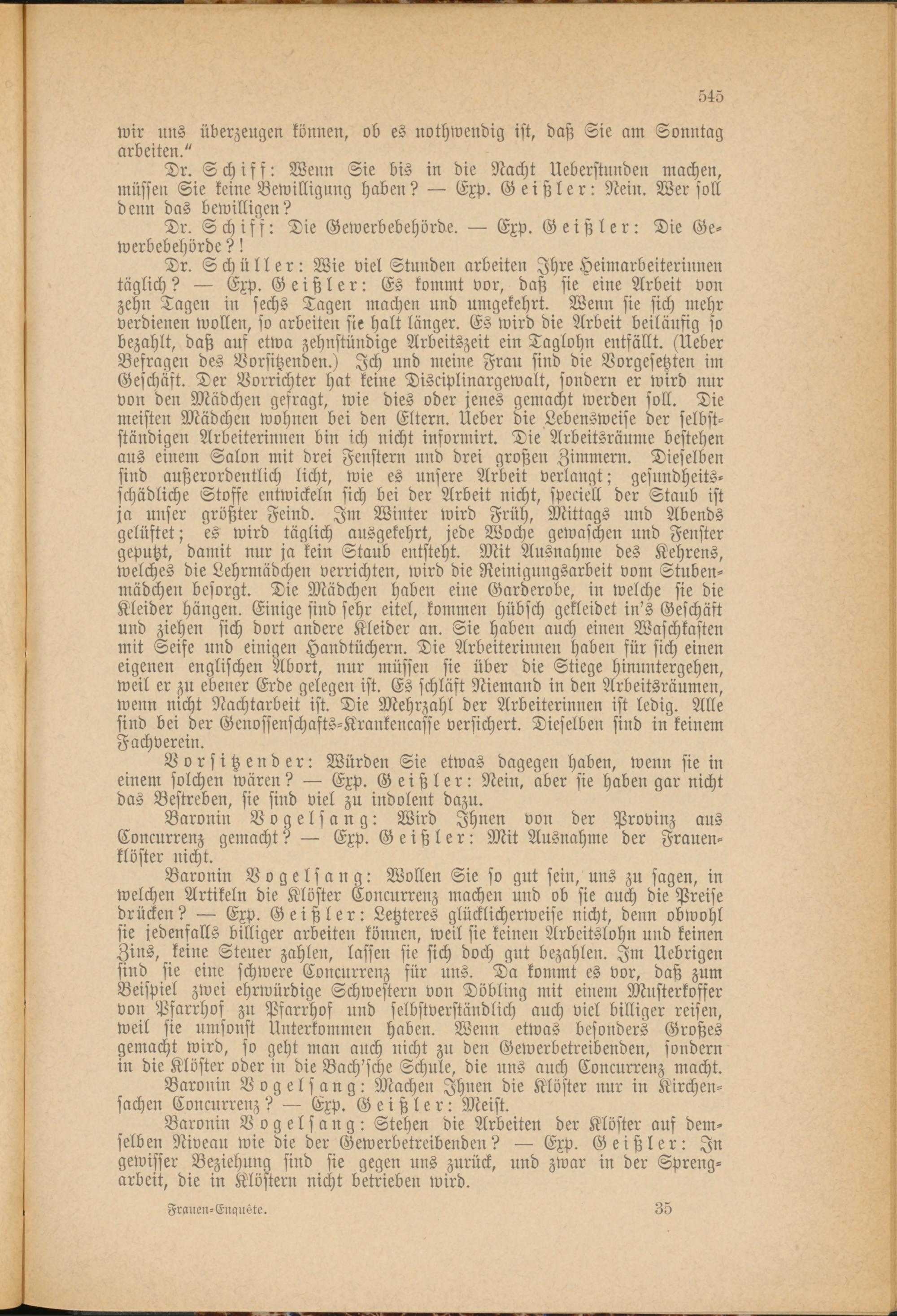 Baronin Vogelfang: Wollen Sie so gut sein, uns zu sagen, in welchen Artikeln die Klöster Concurrenz machen und ob sie auch die Preise drücken? Exp. Geißler: Letzteres glücklicherweise nicht, denn obwohl sie jedenfalls billiger arbeiten können, weil sie keinen Arbeitslohn und keinen Zins, keine Steuer zahlen, lassen sie sich doch gut bezahlen. Im Uebrigen sind sie eine schwere Concurrenz für uns. Da kommt es vor, daß zum Beispiel zwei ehrwürdige Schwestern von Döbling mit einem Musterkoffer von Pfarrhof zu Pfarrhof und selbstverständlich auch viel billiger reisen, weil sie umsonst Unterkommen haben. Wenn etwas besonders Großes gemacht wird, so geht man auch nicht zu den Gewerbetreibenden, sondern in die Klöster oder in die Bach'sche Schule, die uns auch Concurrenz macht.