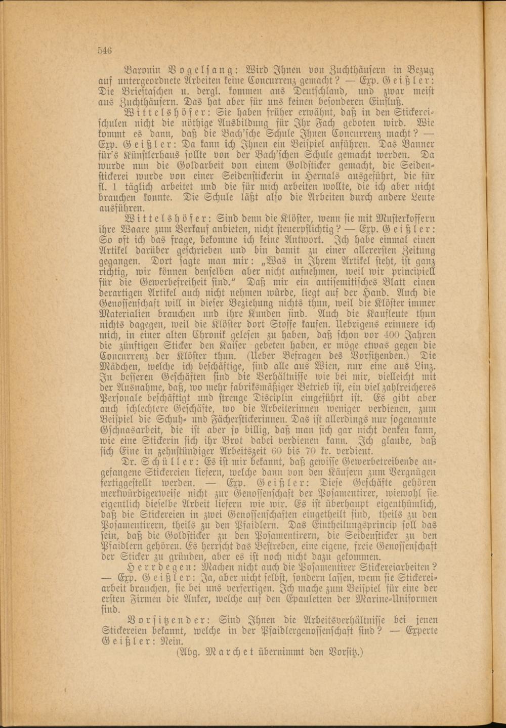 Wittelshöfer: Sind denn die Klöster, wenn sie mit Musterkoffern ihre Waare zum Verkauf anbieten, nicht steuerpflichtig? — Exp. Geißler: So oft ich das frage, bekomme ich keine Antwort. Ich habe einmal einen Artikel darüber geschrieben und bin damit zu einer allerersten Zeitung gegangen. Dort sagte man mir: „Was in Ihrem Artikel steht, ist ganz richtig, wir können denselben aber nicht aufnehmen, weil wir principiell für die Gewerbesreiheit sind." Daß mir ein antisemitisches Blatt einen derartigen Artikel auch nicht nehmen würde, liegt auf der Hand. Auch die Genossenschaft will in dieser Beziehung nichts thun, weil die Klöster immer Materialien brauchen und ihre Kunden sind. Auch die Kaufleute thun nichts dagegen, weil die Klöster dort Stoffe kaufen. Uebrigens erinnere ich mich, in einer alten Chronik gelesen zu haben, daß schon vor 400 Jahren die zünftigen Sticker den Kaiser gebeten haben, er möge etwas gegen die Concnrrenz der Klöster thun. (lieber Befragen des Vorsitzenden.) Die Mädchen, welche ich beschäftige, sind alle aus Wien, nur eine aus Linz. In besseren Geschäften sind die Verhältnisse wie bei mir, vielleicht mit der Ausnahme, daß, wo mehr fabriksmäßiger Betrieb ist, ein viel zahlreicheres Personale beschäftigt und strenge Disciplin eingeführt ist. Es gibt aber auch schlechtere Geschäfte, wo die Arbeiterinnen weniger verdienen, zum Beispiel die Schuh- und Fächerstickerinnen. Das ist allerdings nur sogenannte Gfchnasarbeit, die ist aber so billig, daß man sich gar nicht denken kann, wie eine Stickerin sich ihr Brot dabei verdienen kann. Ich glaube, daß sich Eine in zehnstündiger Arbeitszeit 60 bis 70 kr. verdient.