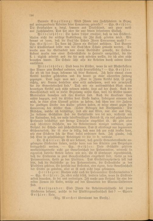 Vorsitzender: Sind Ihnen die Arbeitsverhältnisse bei jenen Stickereien bekannt, welche in der Psaidlergenossenschaft sind? — Experte Geißler: Nein.