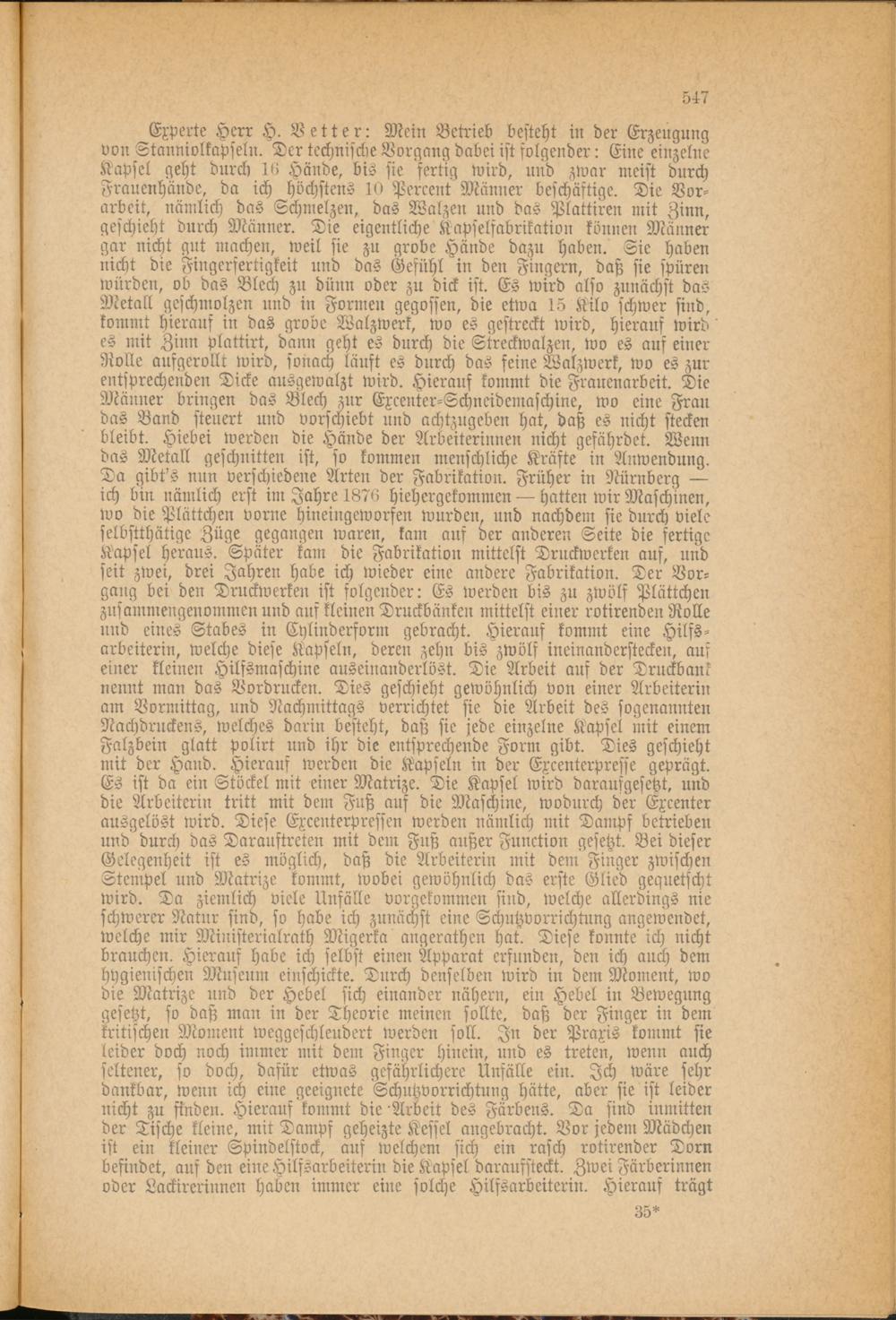 Experte Herr H. Vetter: Mein Betrieb besteht in der Erzeugung von Stanniolkapseln. Der technische Vorgang dabei ist solgender: Eine einzelne Kapsel geht durch 16 Hände, bis sie fertig wird, und zwar meist durch Frauenhände, da ich höchstens 10 Percent Männer beschäftige. Die Vor­arbeit, nämlich das Schmelzen, das Walzen und das Plattiren mit Zinn, geschieht durch Männer. Die eigentliche Kapselfabrikation können Männer gar nicht gut machen, weil sie zu grobe Hände dazu haben. Sie haben nicht die Fingerfertigkeit und das Gefühl ^in den Fingern, daß sie spüren würden, ob das Blech zu dünn oder zu dick ist. Es wird also zunächst das Metall geschmolzen und in Formen gegossen, die etwa 15 Kilo schwer sind, kommt hieraus in das grobe Walzwerk, wo es gestreckt wird, hieraus wird es mit Zinn plattirt, dann geht es durch die Streckwalzen, wo es aus einer Rotte ausgerollt wird, sonach läuft es durch das feine Walzwerk, wo es zur entsprechenden Dicke ausgewalzt wird. Hierauf kommt die Frauenarbeit. Die Männer bringen das Blech zur Excenter-Schneidemaschine, wo eine Frau das Band steuert und vorschiebt und achtzugeben hat, daß es nicht stecken bleibt. Hiebei werden die Hände der Arbeiterinnen nicht gefährdet. Wenn das Metall geschnitten ist, so kommen menschliche Kräfte in Anwendung. Da gibt's nun verschiedene Arten der Fabrikation. Früher in Nürnberg ich bin nämlich erst im Jahre 1876 hiehergekommen hatten wir Maschinen, wo die Plättchen vorne hineingeworfen wurden, und nachdem sie durch viele selbstthätige Züge gegangen waren, kam aus der anderen Seite die fertige Kapsel heraus. Später kam die Fabrikation mittelst Druckwerken auf, und seit zwei, drei Jahren habe ich wieder eine andere Fabrikation. Der Vor­gang bei den Druckwerken ist folgender: Es werden bis zu zwölf Plättchen zusammengenommen und aus kleinen Druckbänken mittelst einer rotirenden Rolle und eines Stabes in Cylinderform gebracht. Hierauf kommt eine Hilfs- arbeiterin, welche diese Kapseln, deren zehn bis zwölf ineinanderstecken, aus einer kleinen Hilfsmaschine auseinanderlöst. Die Arbeit auf der Trnckbank nennt man das Vordrucken. Dies geschieht gewöhnlich von einer Arbeiterin am Vormittag, und Nachmittags verrichtet sie die Arbeit des sogenannten Nachdrückens, welches darin besteht, daß sie jede einzelne Kapsel mit einem Falzbein glatt Polirt und ihr die entsprechende Form gibt. Dies geschieht mit der Hand. Hieraus werden die Kapseln in der Exzenterpresse geprägt. Es ist da ein Stöcke! mit einer Matrize. Die Kapsel wird darausgesetzt, und die Arbeiterin tritt mit dem Fuß auf die Maschine, wodurch der Excenter ausgelöst wird. Diese Excenterpressen werden nämlich mit Dampf betrieben und durch das Darauftreten mit dem Fuß außer Function gesetzt. Bei dieser Gelegenheit ist es möglich, daß die Arbeiterin mit dem Finger zwischen Stempel und Matrize kommt, wobei gewöhnlich das erste Glied gequetscht wird. Da ziemlich viele Unfälle vorgekommen sind, welche allerdings nie schwerer Natur sind, so habe ich zunächst eine Schutzvorrichtung angewendet, welche mir Ministerialrath Migerka angerathen hat. Diese konnte ich nicht brauchen. Hierauf habe ich selbst einen Apparat erfunden, den ich auch dem hygienischen Museum einschickte. Durch denselben wird in dem Moment, wo die Matrize und der Hebel sich einander nähern, ein Hebel in Bewegung gesetzt, so daß man in der Theorie meinen sollte, daß der Finger in dem kritischen Moment weggeschleudert werden soll. In der Praxis kommt sie leider doch noch immer mit dem Finger hinein, und es treten, wenn auch seltener, so doch, dafür etwas gefährlichere Unfälle ein. Ich wäre sehr dankbar, wenn ich eine geeignete Schutzvorrichtung hätte, aber sie ist leider nicht zu finden. Hierauf kommt die Arbeit des Färbens. Da sind inmitten der Tische kleine, mit Dampf geheizte Kessel angebracht. Vor jedem Mädchen ist ein kleiner Spindelstock, auf welchem sich ein rasch rotirender Dorn befindet, aus den eine Hilfsarbeiterin die Kapsel daraufsteckt. Zwei Färberinnen oder Lackirerinnen haben immer eine solche Hilfsarbeiterin. Hieraus trägt