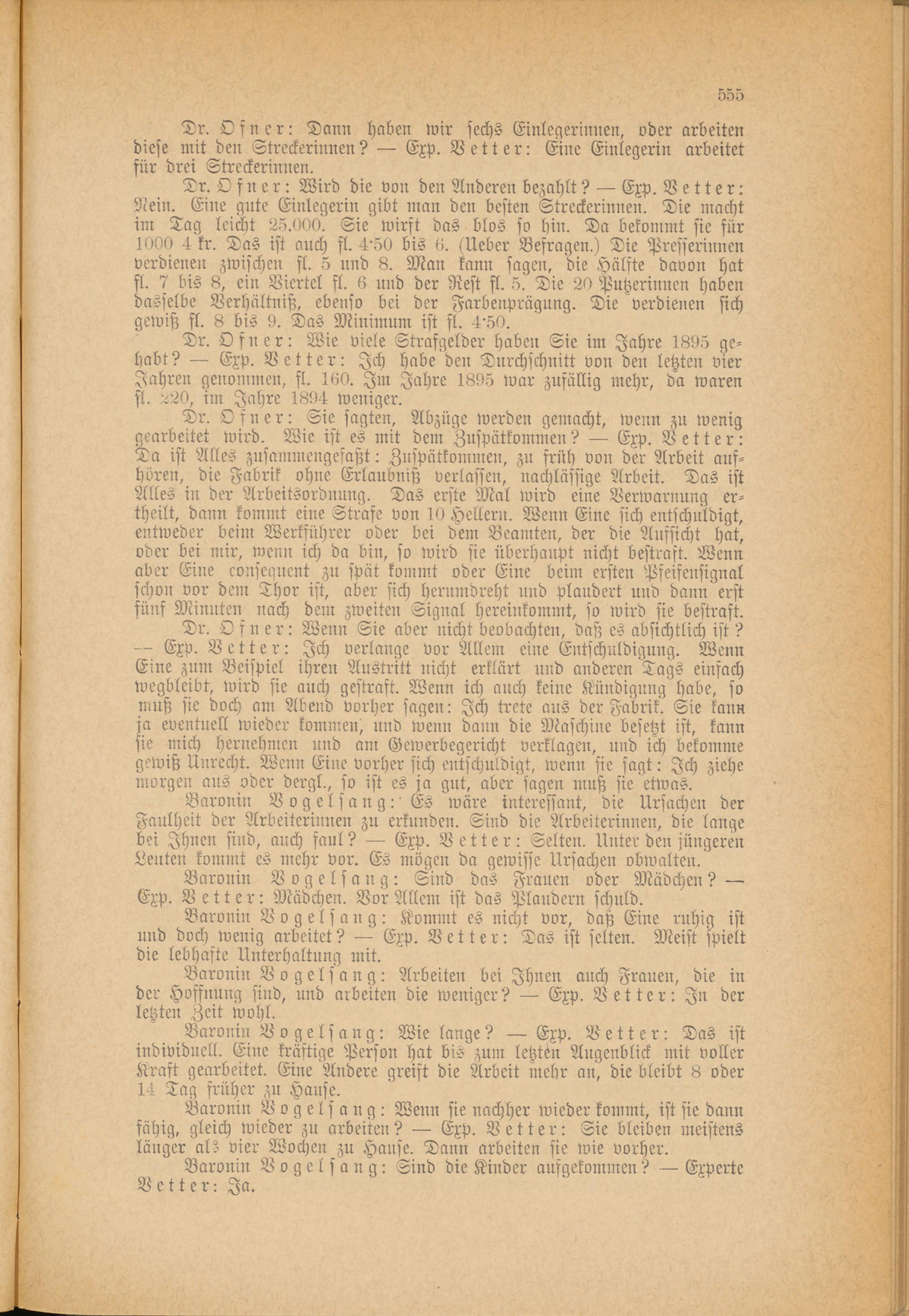 Dr. Ofner: Wie viele Strafgelder haben Sie im Jahre 1895 gehabt? — Exp. Vetter: Ich habe den Durchschnitt von den letzten vier Jahren genommen, fl. 100. Im Jahre 1895 war zufällig mehr, da waren fl. :^20, im Jahre 1894 weniger.